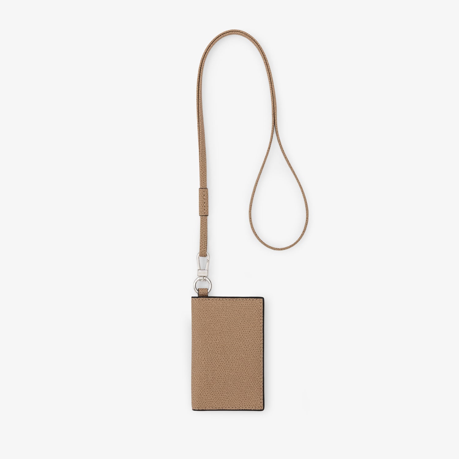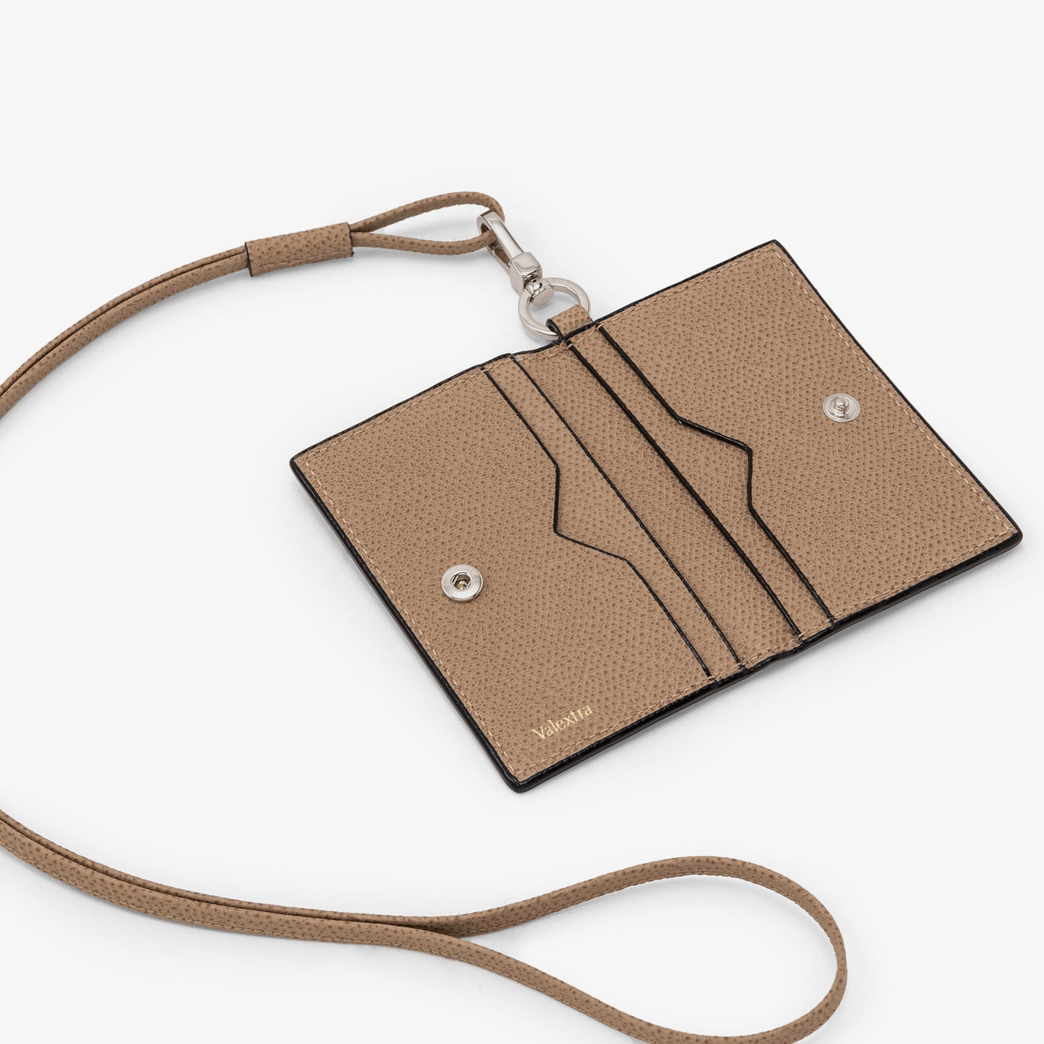 取り外し可能なストラップ付きの二つ折りカードホルダーは、必需品を安全に手元に置いておきたいというニーズを満たすように設計されており、職人の手仕事によるブラックラッカー仕上げのエッジペインティングであるコスタが施されています。ストラップを使い、首から掛けることも、ハンドバッグに結び付けることも。