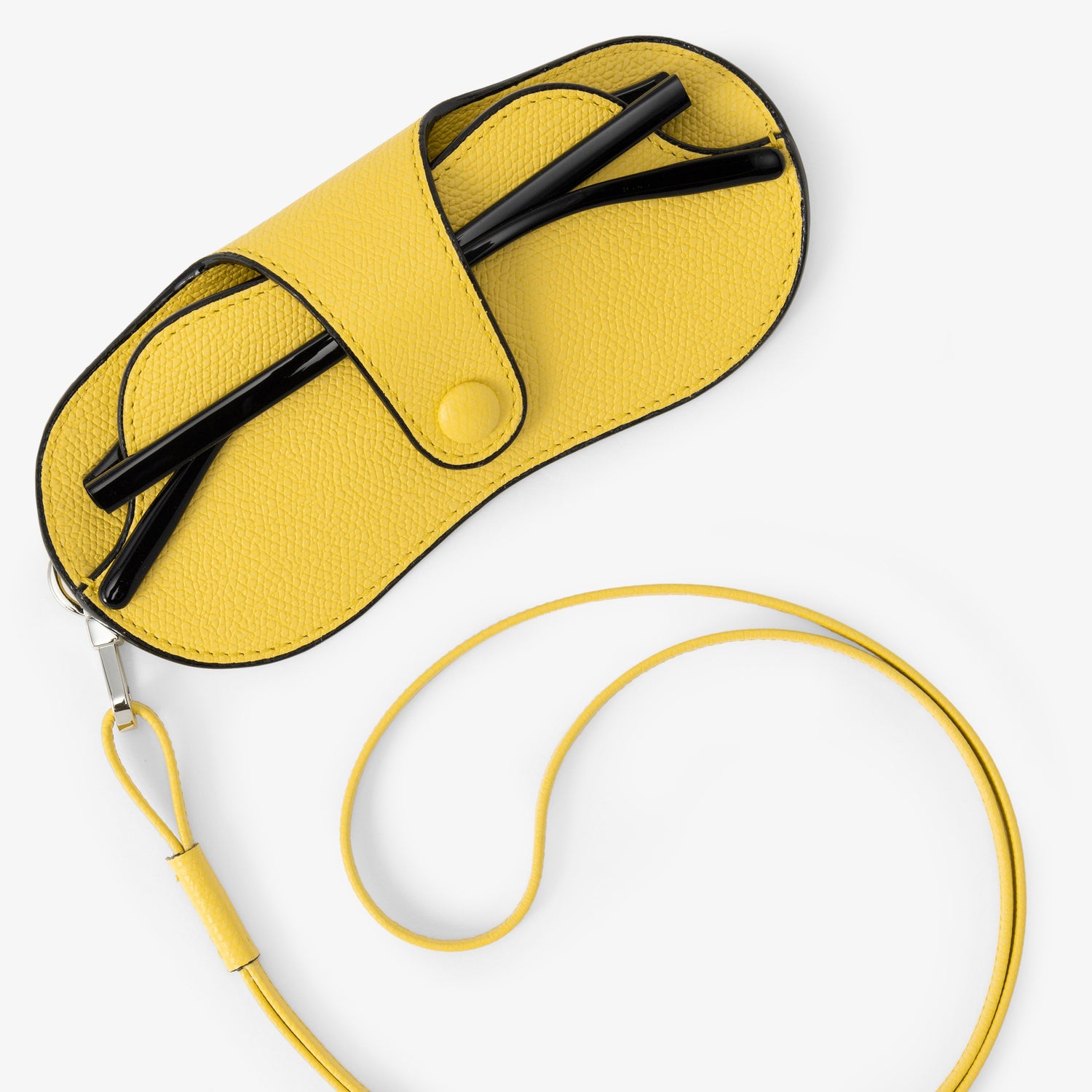 シンプルなデザインの眼鏡ケース。デザイン性のある大き目の眼鏡/サングラスも収納することができ、取り外し可能なネックストラップを付けてアクセサリー感覚で着用することもできます。