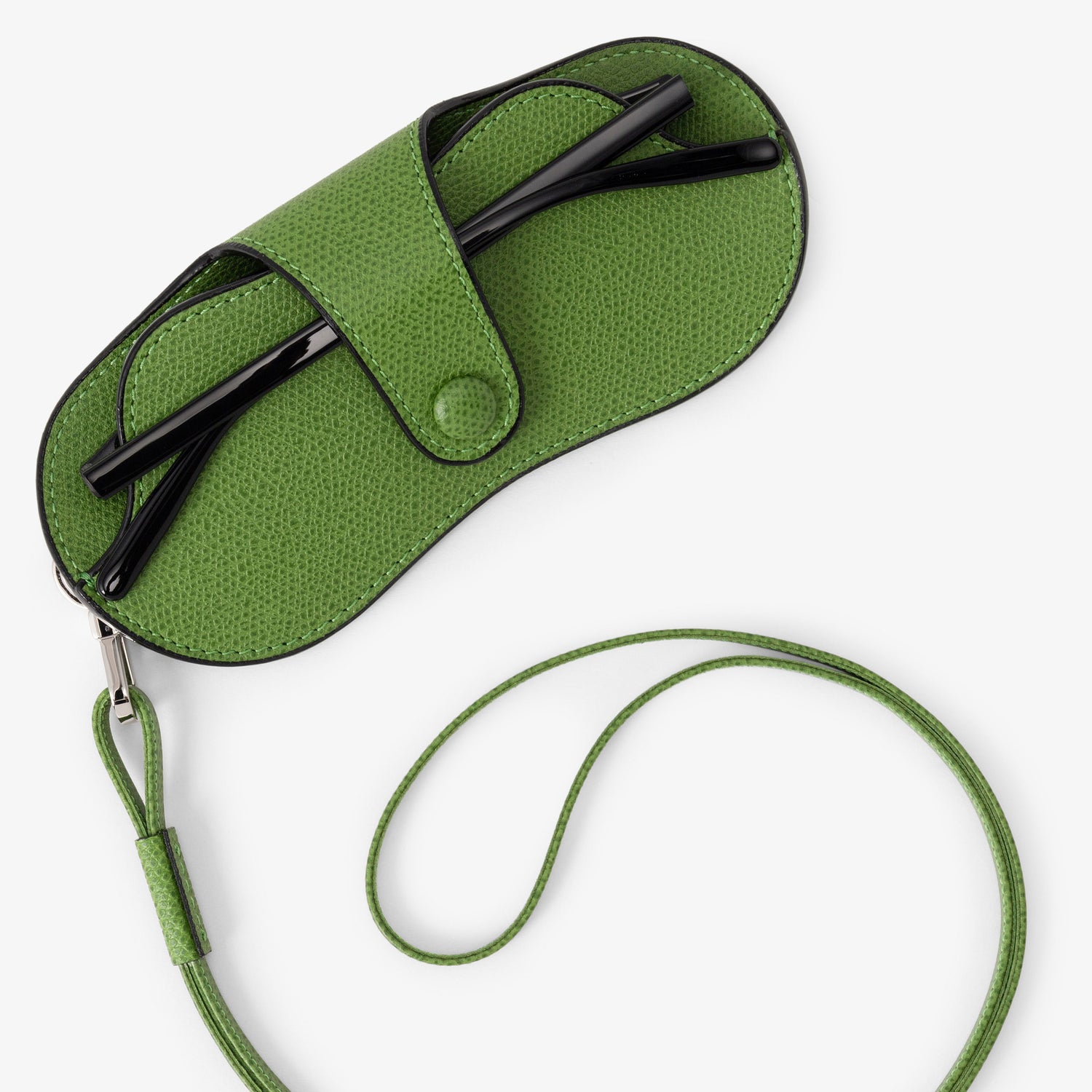 シンプルなデザインの眼鏡ケース。デザイン性のある大き目の眼鏡/サングラスも収納することができ、取り外し可能なネックストラップを付けてアクセサリー感覚で着用することもできます。