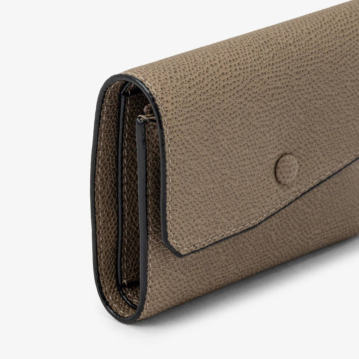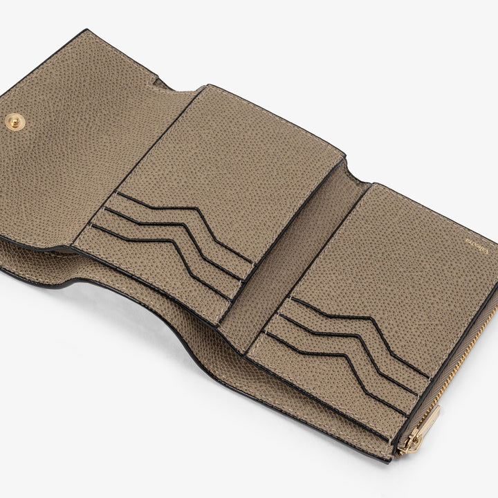 スナップ付きのフラップで包めるコンパクトな折り財布です。6つのカードスロットに紙幣用のコンパートメント、ファスナー付きの小銭入れを備えています。すべて職人の手作業により仕上げられるブラックラッカー仕上げのコスタエッジが控えめながらもユニークな存在感を与えます。