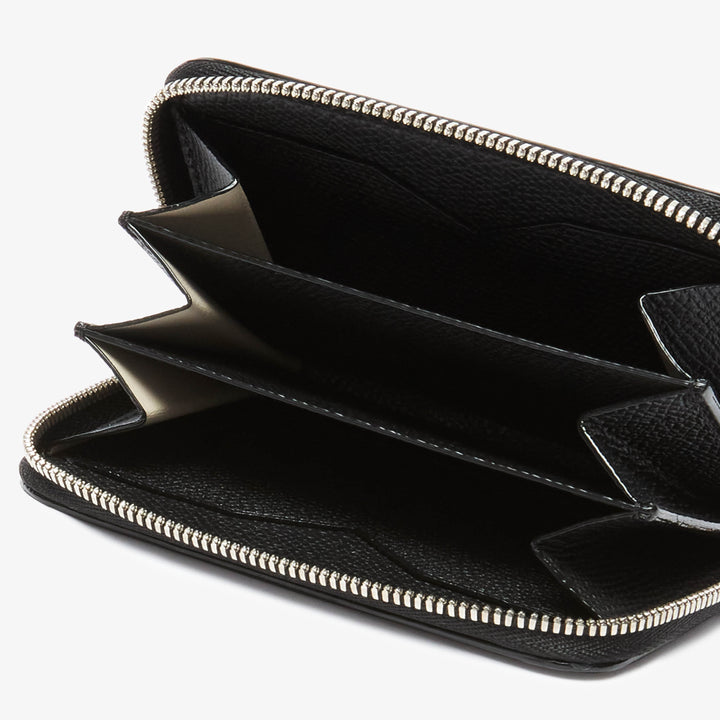 ジップ式のミニウォレット。豊富なカラーバリエーションを展開しています。内側にはブランドの象徴であるV字カットが施されたクレジットカードホルダー2つ付き。コバと呼ばれる革をカットした端の部分はヴァレクストラ独自の染料“Costa”を手作業で何層にも塗り重ねて磨き上げました。