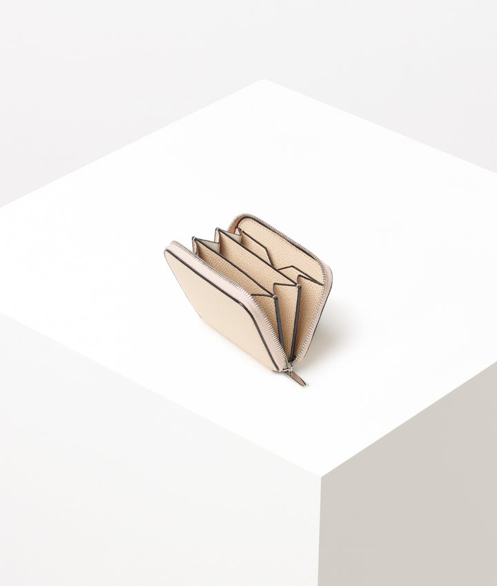 ジップ式のミニウォレット。豊富なカラーバリエーションを展開しています。内側にはブランドの象徴であるV字カットが施されたクレジットカードホルダー2つ付き。コバと呼ばれる革をカットした端の部分はヴァレクストラ独自の染料“Costa”を手作業で何層にも塗り重ねて磨き上げました。