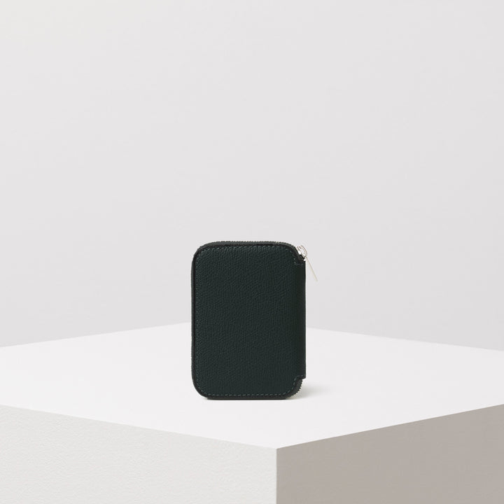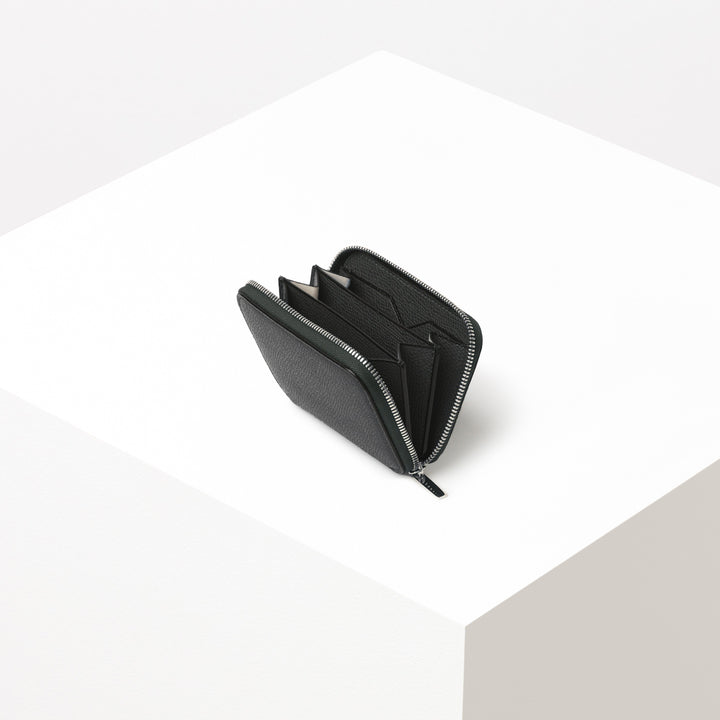 ジップ式のミニウォレット。豊富なカラーバリエーションを展開しています。内側にはブランドの象徴であるV字カットが施されたクレジットカードホルダー2つ付き。コバと呼ばれる革をカットした端の部分はヴァレクストラ独自の染料“Costa”を手作業で何層にも塗り重ねて磨き上げました。