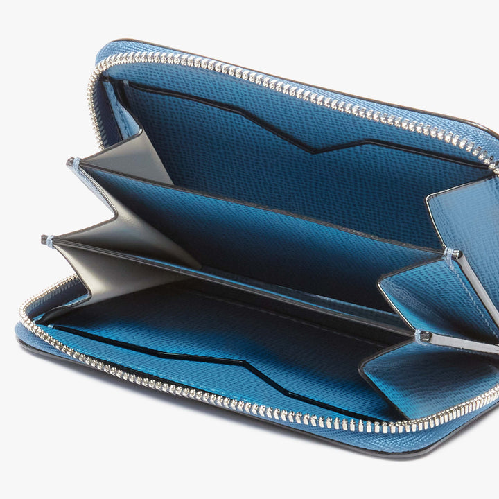 ジップ式のミニウォレット。豊富なカラーバリエーションを展開しています。内側にはブランドの象徴であるV字カットが施されたクレジットカードホルダー2つ付き。コバと呼ばれる革をカットした端の部分はヴァレクストラ独自の染料”Costa”を手作業で何層にも塗り重ねて磨き上げました。