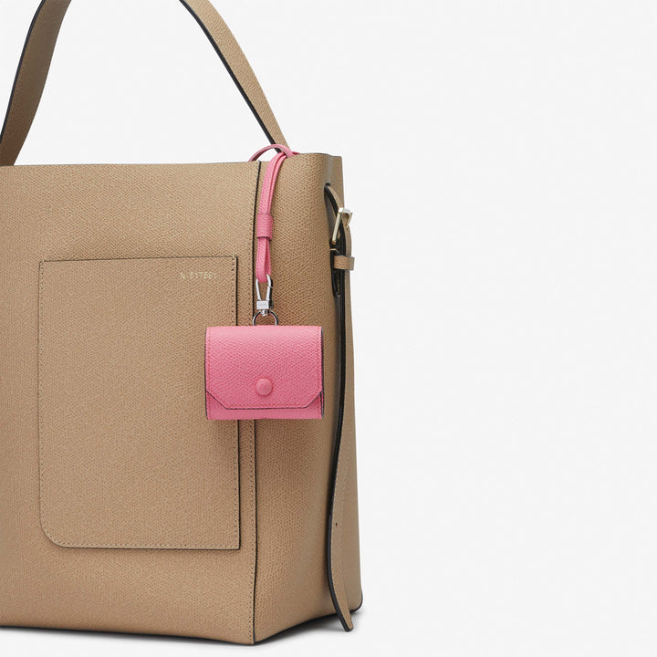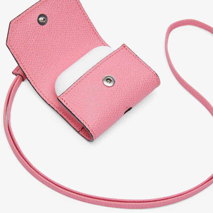 スナップボタンにはボディと同色のくるみボタンを使うなど、機能性とフィネスをあわせ持つエアポッドプロケースです。ストラップは取り外し可能なので、首から下げる他にもベルトループやバッグなどに直接アタッチして持ち運ぶことも出来ます。