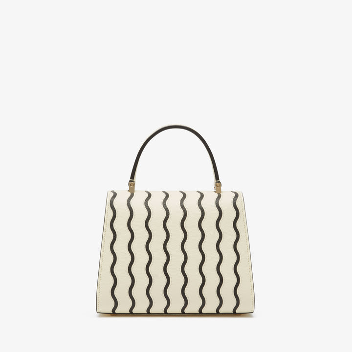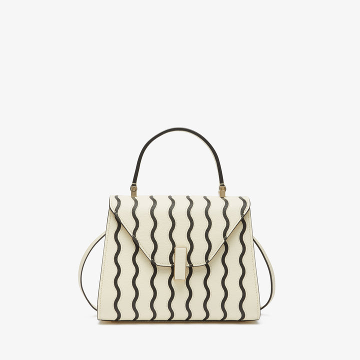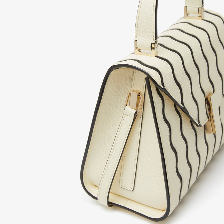 ミニ イジィデ ウェーブは、独自のインターシャ技術によってレザーのパネルを複雑に重ねることで波状のパターンを表現。その結果、アート作品のようなステートメント性が与えられました。バッグ本体には日常の必需品を十分に収納できるスペースがあり、付属する長さ調節可能なストラップにより、肩にかけたり斜めがけしたりすることもできます。