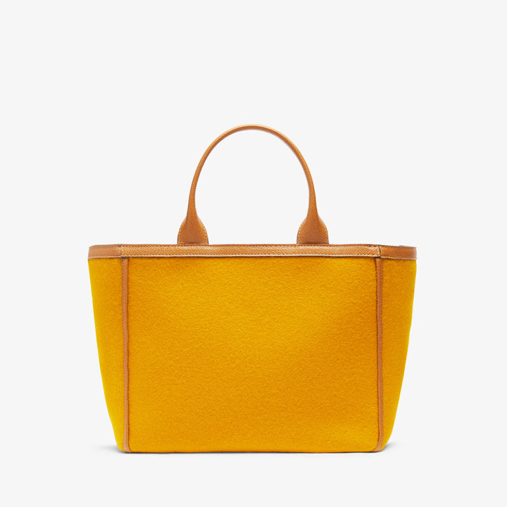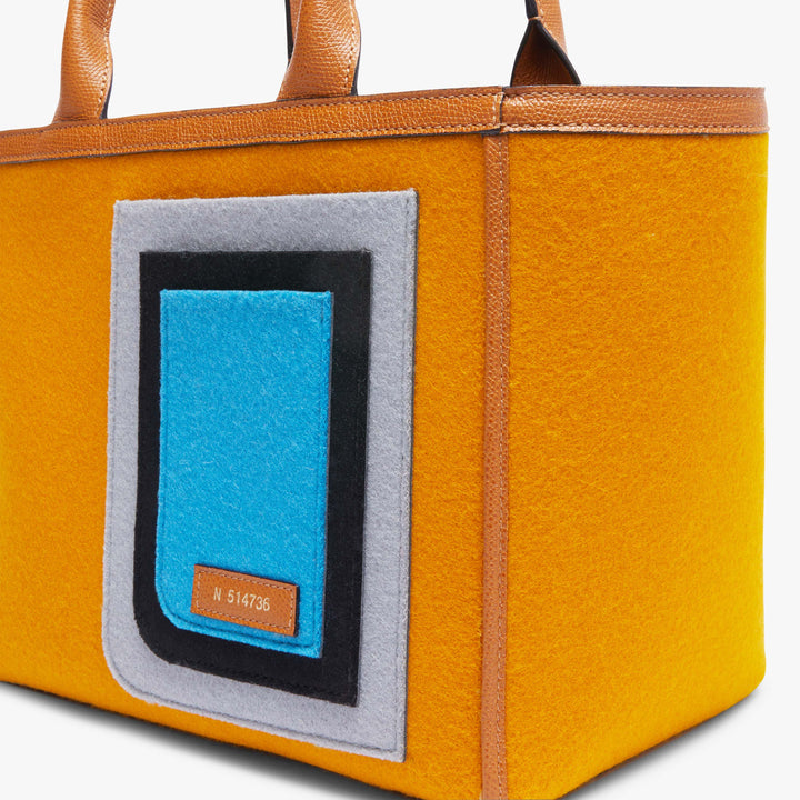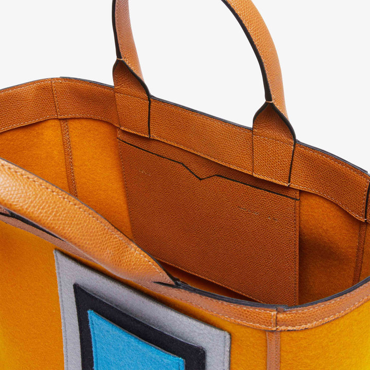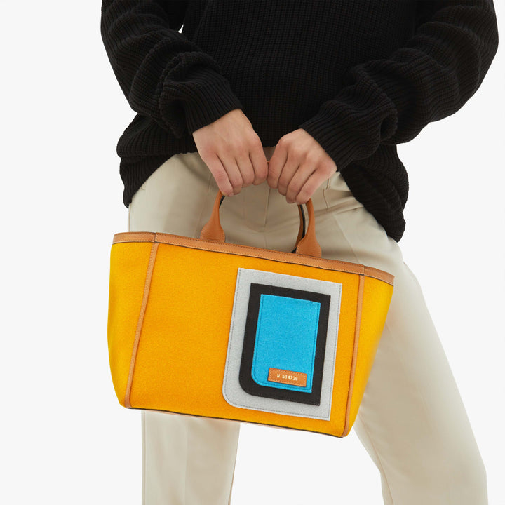 フェルト素材をつかったミニサイズのトートバッグです。色の異なるフェルトを組み合わせることで視覚的な立体感を表現したこのバッグは、持ち歩けるポップアートと言えます。そして、ヴァレクストラのレザーグッズの特徴である漆黒のエッジペインティングがシルエットの美しさを強調してくれます。