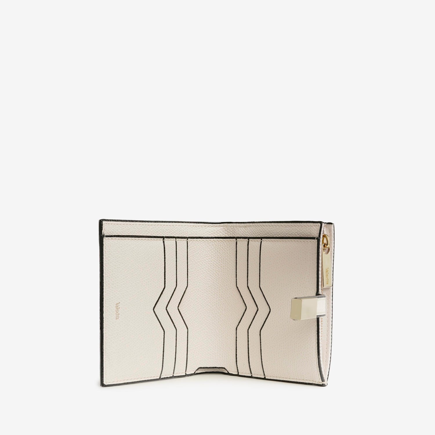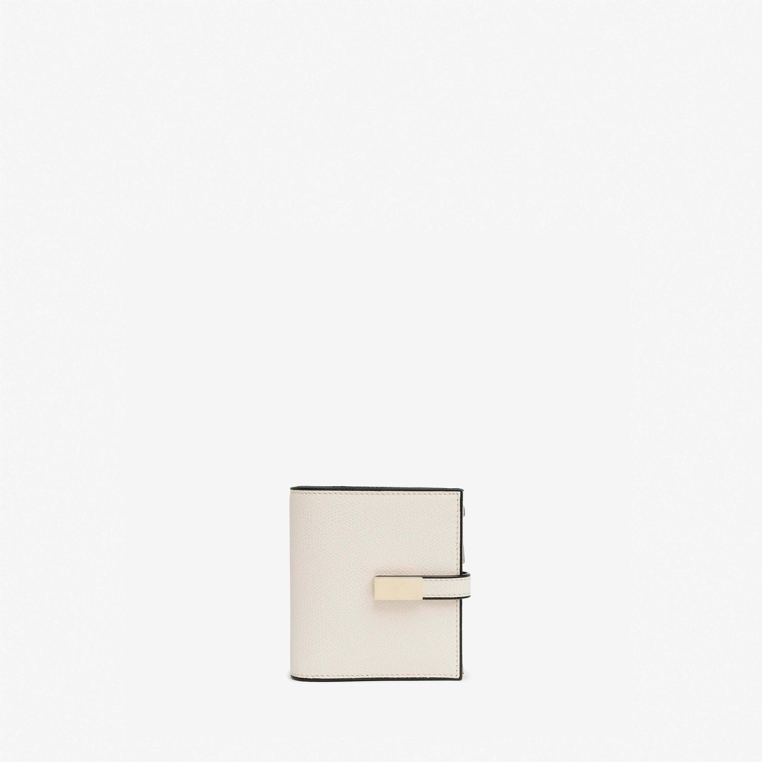 ゴールドのメタルパーツが印象的なコンパクトで機能的な二つ折り財布です。片側には薄いマチのファスナー付きコインポケット、もう片側にはスナップボタンで留める6つのカードスロットと紙幣を折り畳まずに収納できるコンパートメントを備えています。