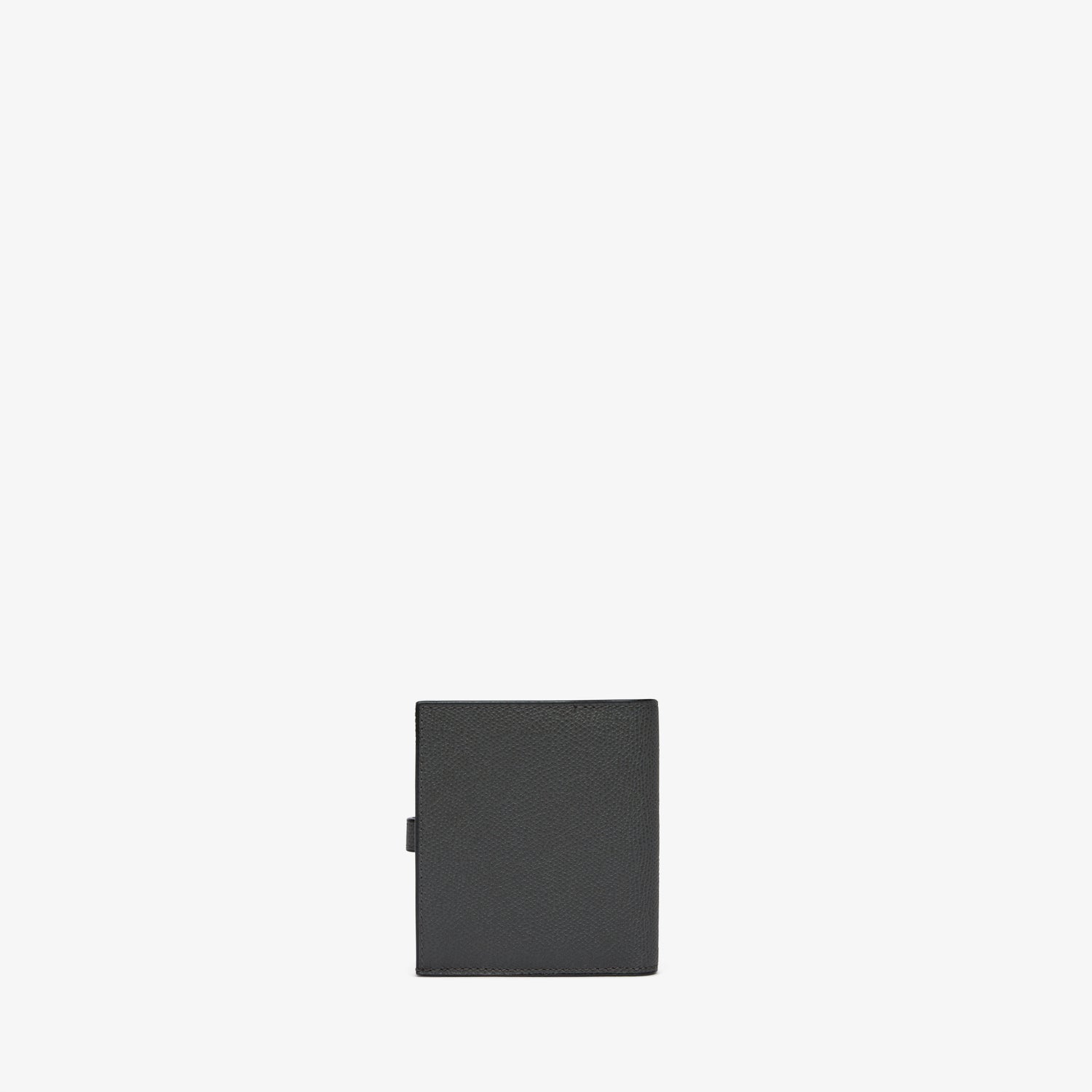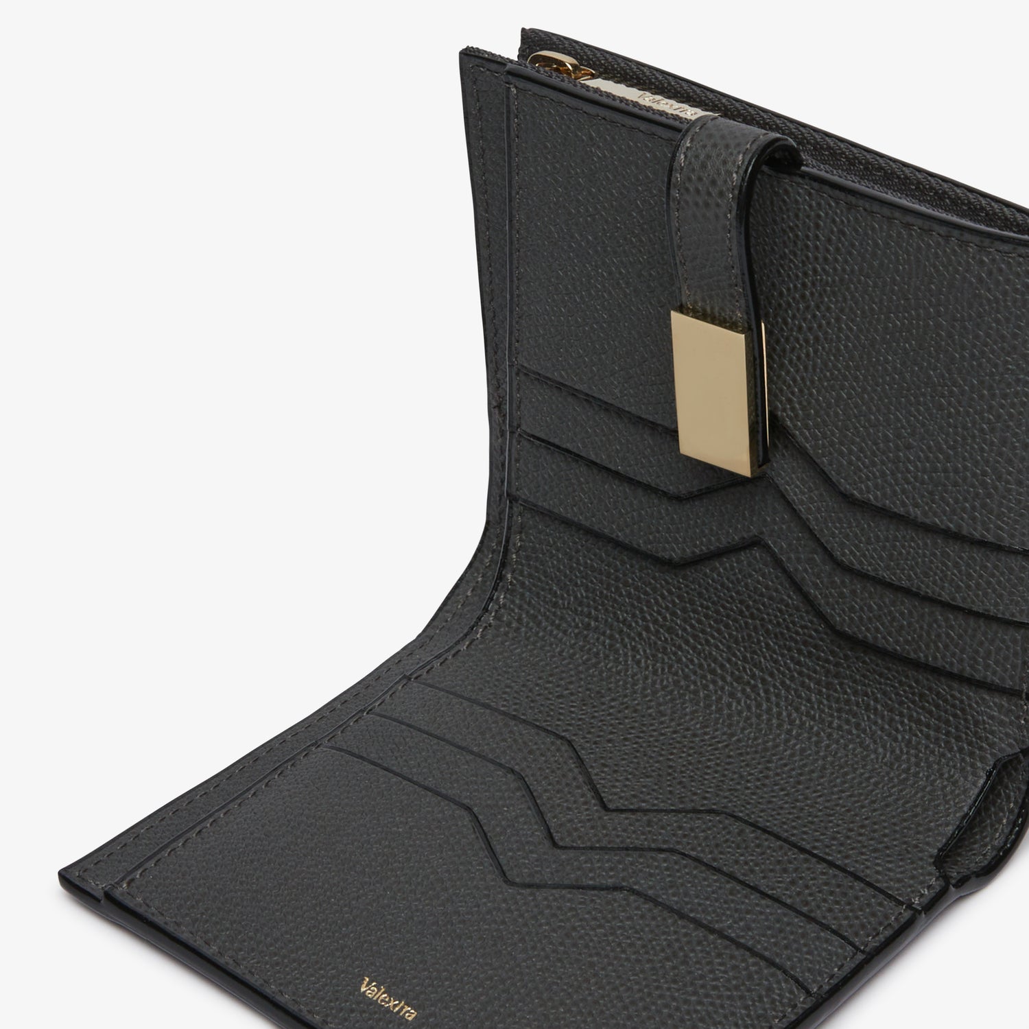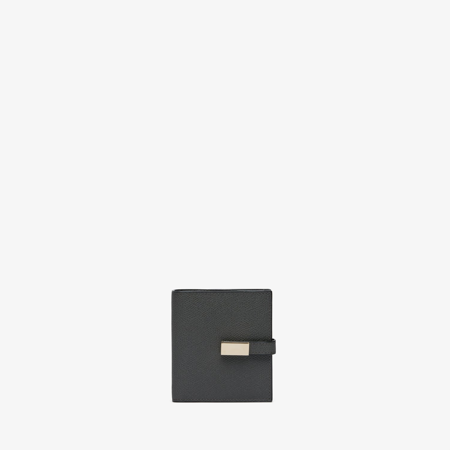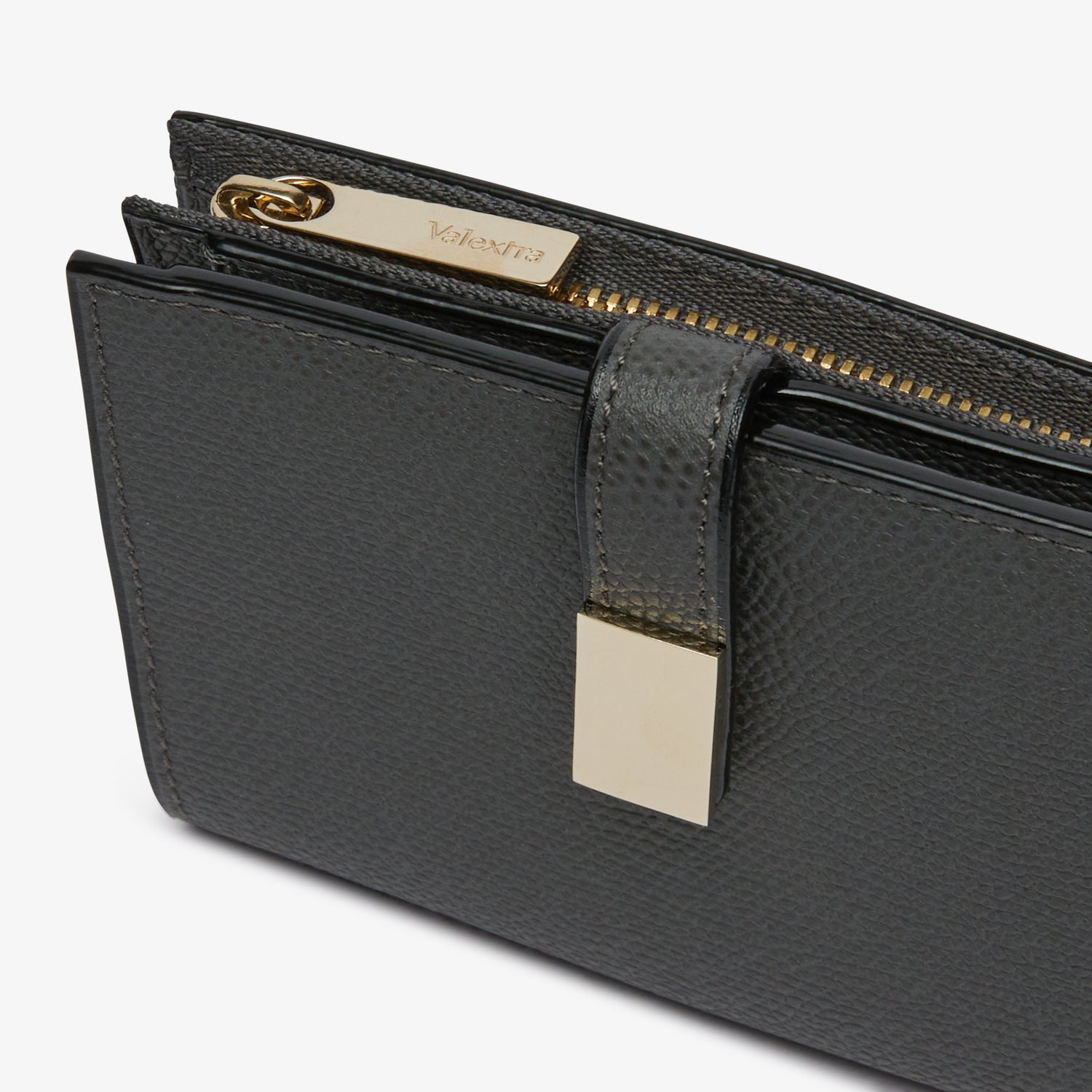 ゴールドのメタルパーツが印象的なコンパクトで機能的な二つ折り財布です。片側には薄いマチのファスナー付きコインポケット、もう片側にはスナップボタンで留める6つのカードスロットと紙幣を折り畳まずに収納できるコンパートメントを備えています。