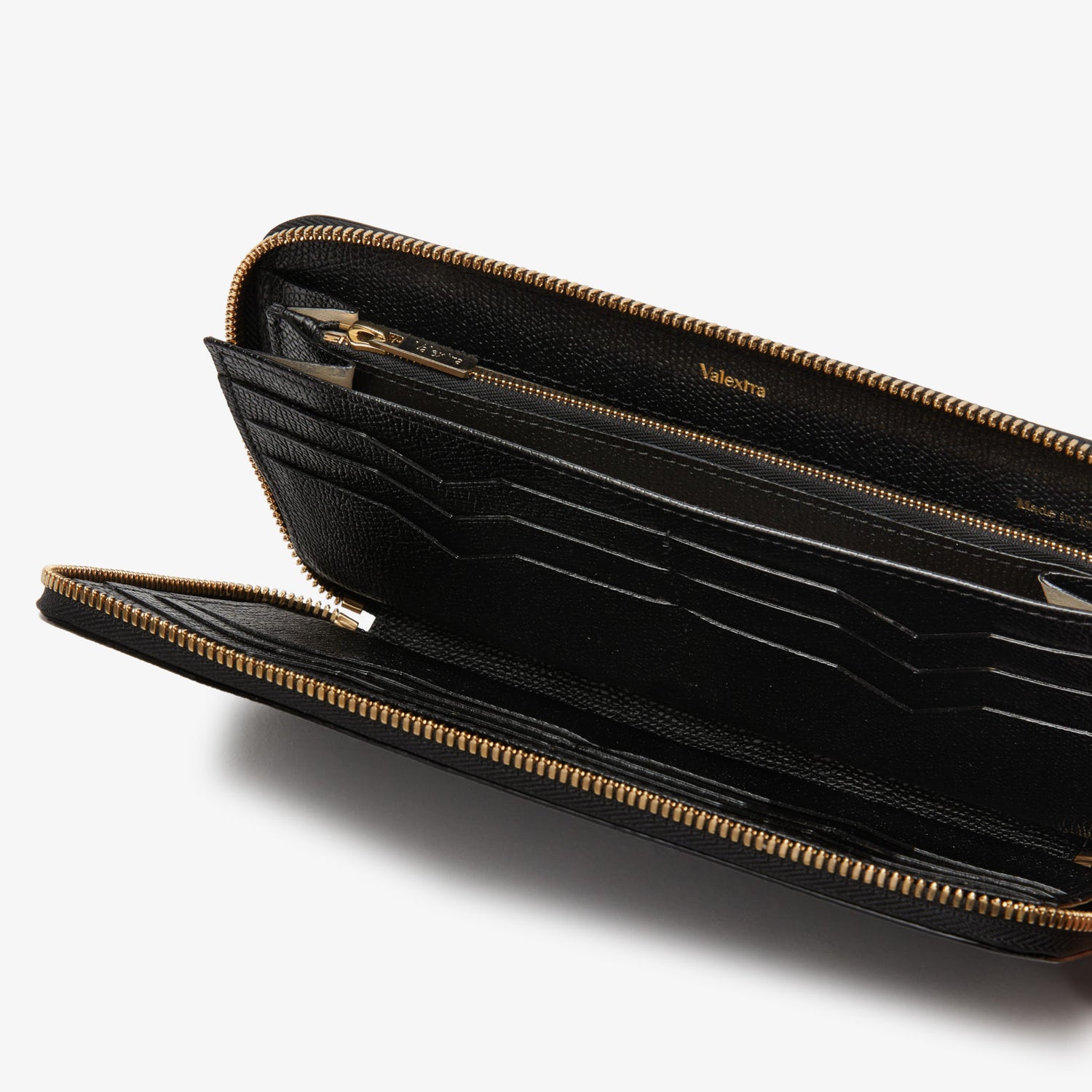 ヴィンテージ感のあるデザインのラウンドジップウォレットから着想を得て、贅沢なレザー使いとイタリアの熟練のクラフトマンシップを投入したデザイン。内側にはブランドの象徴であるV字カットが施された12枚のクレジットカード用ホルダー、コンパートメントが2つ、ジッパー式コインケース付き。ライナーはしなやかな革張り。コバと呼ばれる革をカットした端の部分にヴァレクストラ独自の染料”Costa”を手作業で何層にも塗り重ねて磨き上げました。
