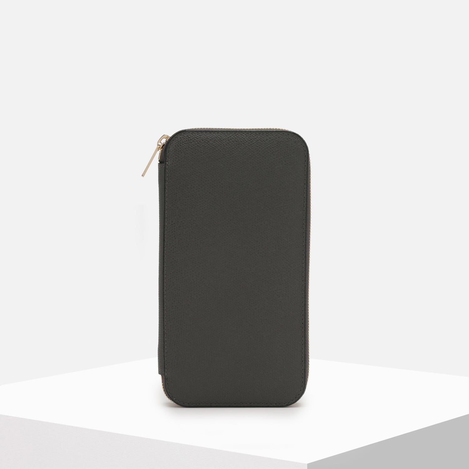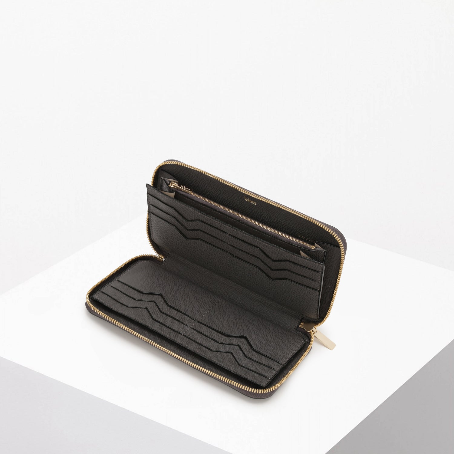 ヴィンテージ感のあるデザインのラウンドジップウォレットから着想を得て、贅沢なレザー使いとイタリアの熟練のクラフトマンシップを投入したデザイン。内側にはブランドの象徴であるV字カットが施された12枚のクレジットカード用ホルダー、コンパートメントが2つ、ジッパー式コインケース付き。ライナーはしなやかな革張り。コバと呼ばれる革をカットした端の部分にヴァレクストラ独自の染料”Costa”を手作業で何層にも塗り重ねて磨き上げました。