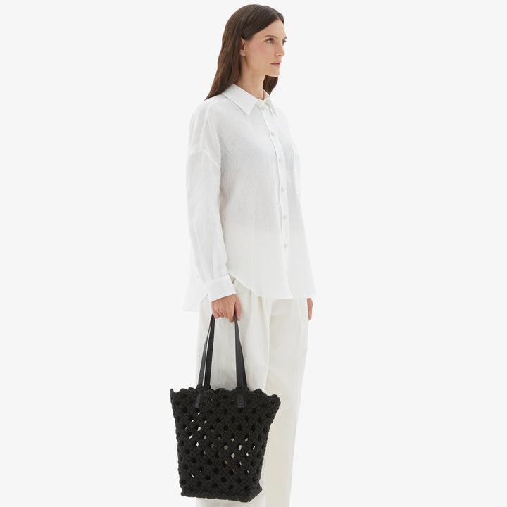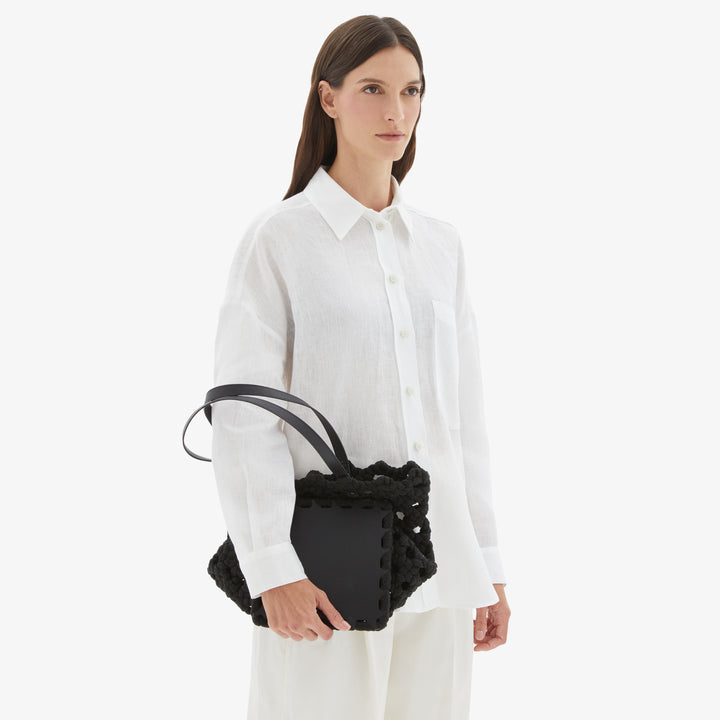 スポルタミヴィアは、伝統的な職人技と現代的な精神が融合したハンドバッグです。ミラノ近郊にあるカントゥの伝統であるトンボロ技法を用い、チューブ状の編みロープと当社の代表的なミレプンテカーフレザーが組み合わされています。肩に快適にフィットするダブルハンドルバッグで休日のワードローブに素敵なアクセントを加えることができます。