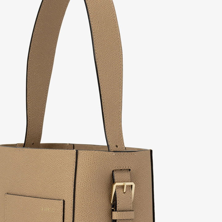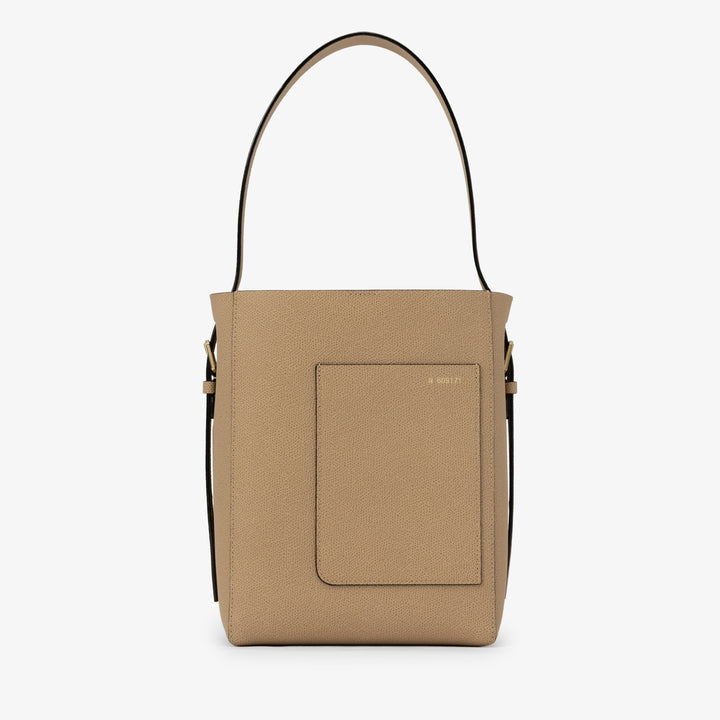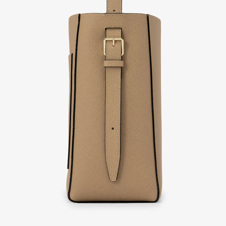 独特の表情を持つミレプンテレザーを使ったバケットバッグスモールは、ミラノのサンバビラにあった一号店のウィンドウのカーブを模した外ポケットや職人がすべて手仕事で仕上げるコスタエッジなど、ヴァレクストラのシグネチャーで構成されています。