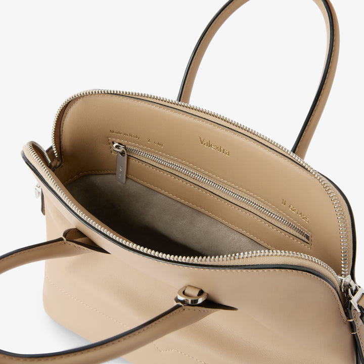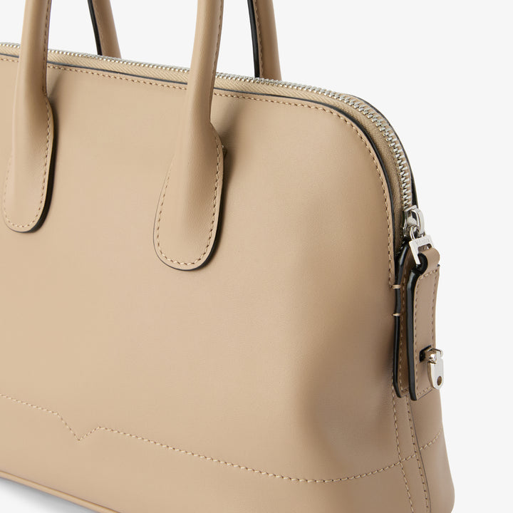 二本のレザーハンドルは手に心地よく、調節・取り外し可能なストラップにより、クロスボディやショルダーとしても自在にお楽しみいただけます。シグネチャーである漆黒のコスタエッジとVカットのディテールで仕上げられ、日常に寄り添いながらも、静かにラグジュアリーを纏う特別なパートナーとなるでしょう。