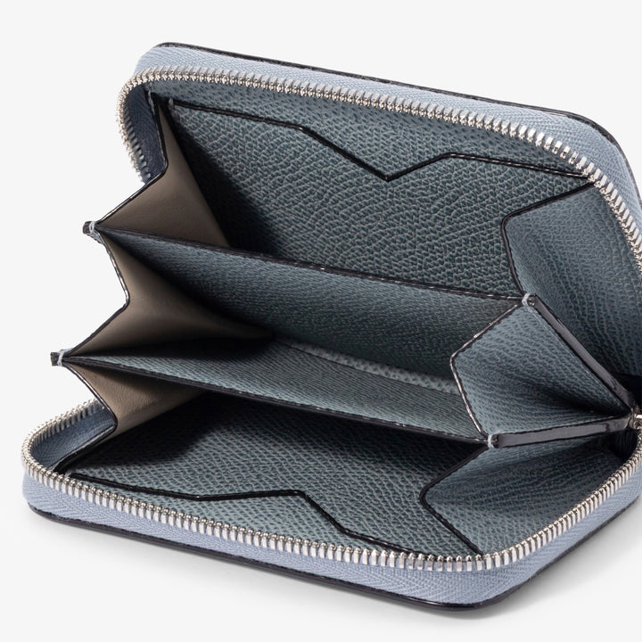 ジップ式のミニウォレット。豊富なカラーバリエーションを展開しています。内側にはブランドの象徴であるV字カットが施されたクレジットカードホルダー2つ付き。コバと呼ばれる革をカットした端の部分はヴァレクストラ独自の染料“Costa”を手作業で何層にも塗り重ねて磨き上げました。