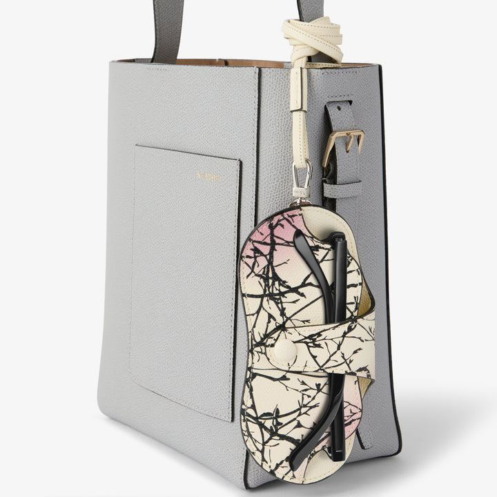 シグネチャーのミレプンテレザーで仕立てたメガネケースは、スリムなストラップにより首に掛けてもバッグに添えても自然に馴染み、持ち運びやすく、出し入れの所作まで美しく見せる、日常のスタイルに静かな上質さを添えるアクセサリーです。ラマージュ柄のスクリーンプリントを採用。色彩と模様に奥行きを与えるため、熟練を要する三段階のプリント工程で表現しており、繊細で立体的な表情がコンパクトなフォルムに独自の個性を宿します。さらに、ブラックラッカーで仕上げたコスタエッジがミニマルな佇まいに上品なアクセントを添え、現代的な美意識と職人技が息づく仕上がりが、毎日にさりげない洗練をもたらします。