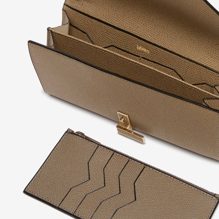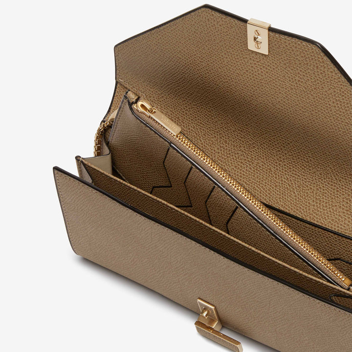 素材はソフトカーフスキン製、内側にはコンパートメントが3つと6枚のカード用のスロット付き。取り外し可能なジッパー式コインケースにはカードスロットが4つあり、クラッチの中に入れて使うのはもちろん、コインケース単体でもお使いいただけます。ヴァレクストラのアイコニックなクロージャーと取り外し可能なゴールドのチェーンのショルダーストラップ付き。