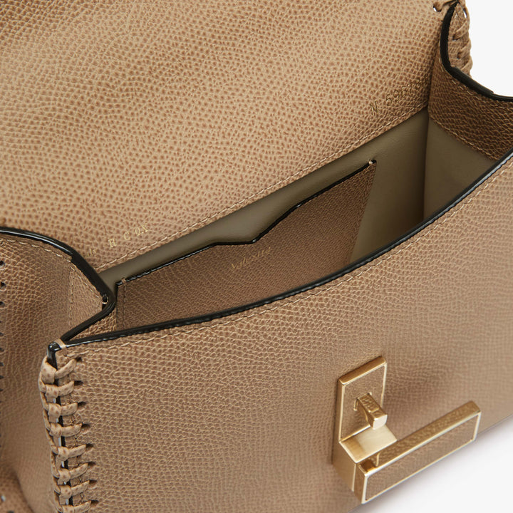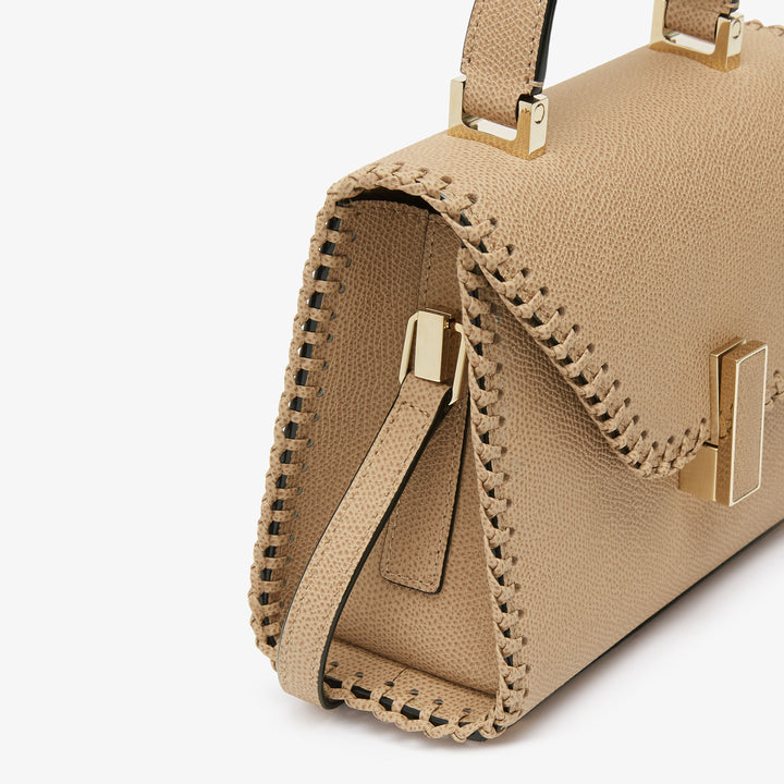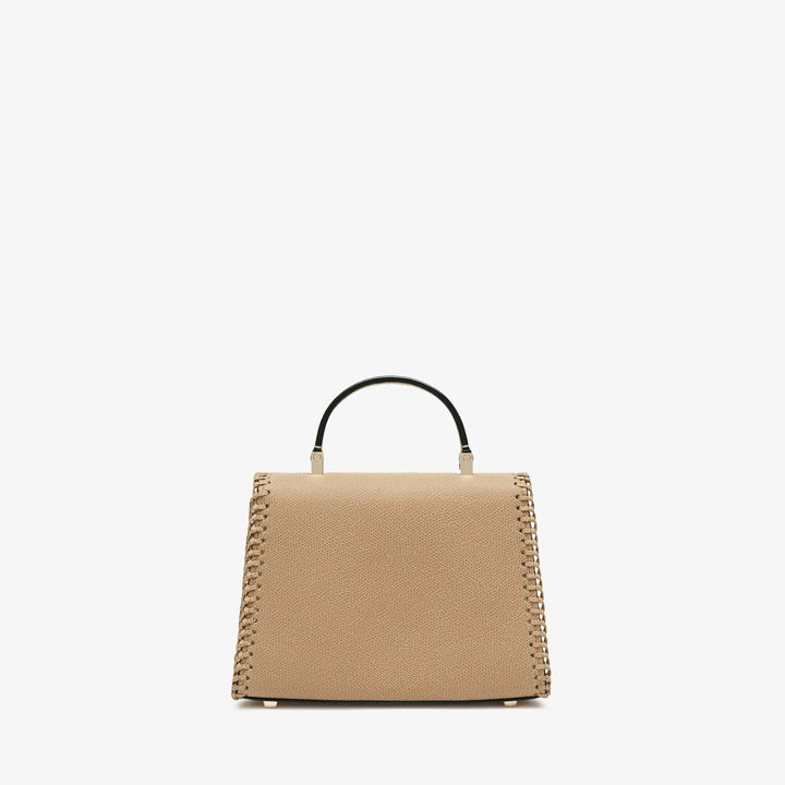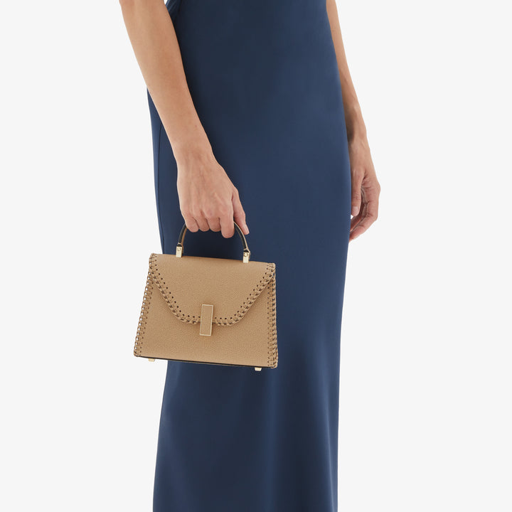 バッグの輪郭に沿って職人の手仕事によるブランケットステッチを施したマイクロ・イジィデは、都会的なエレガンスとクラフツマンシップが融合したアイテムです。メインのコンパートメントは日常生活の必需品を収納できるキャパシティを持ち、ワンハンドルバッグとしてはもちろん、付属のショルダーストラップを使えばクロスキャリーとしても使えます。