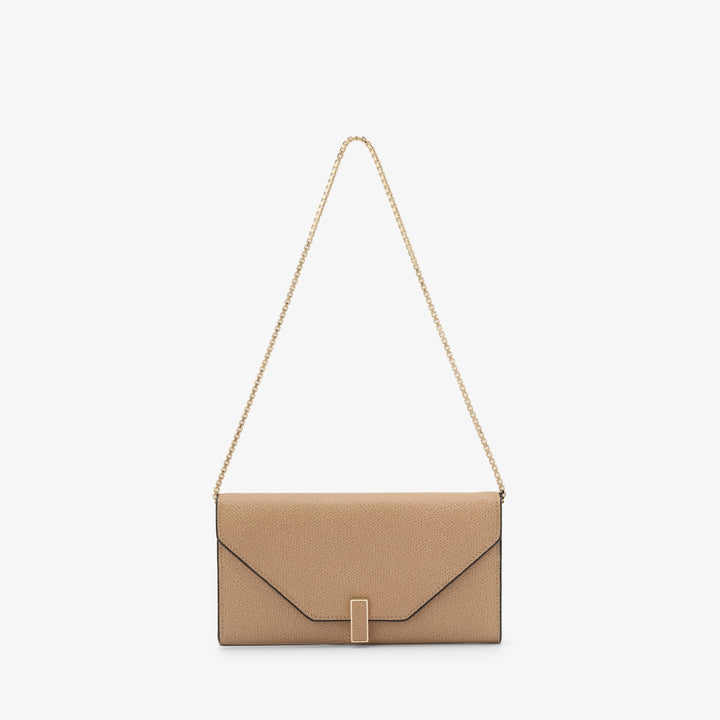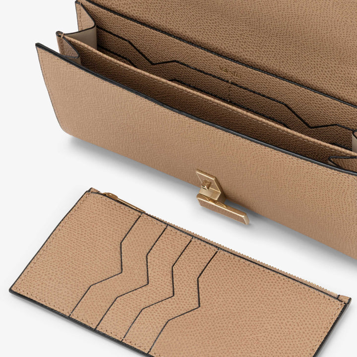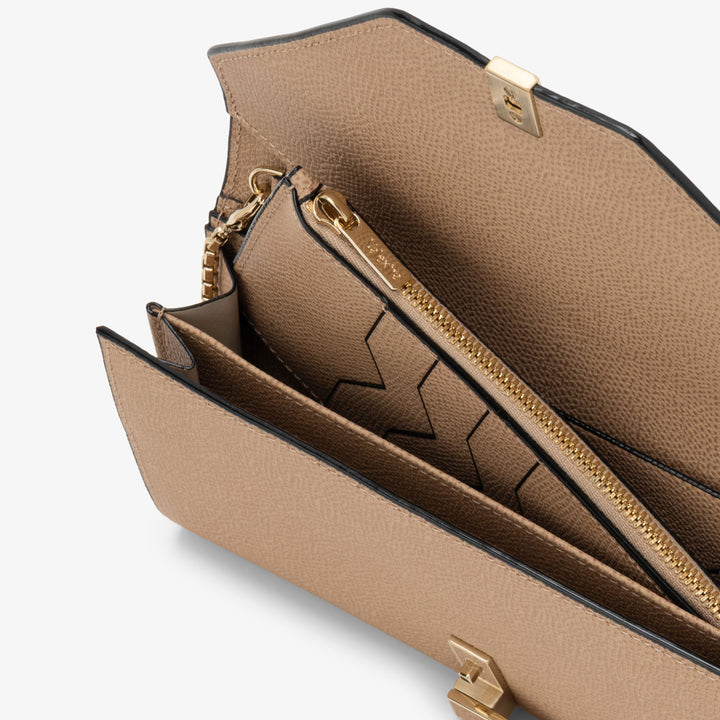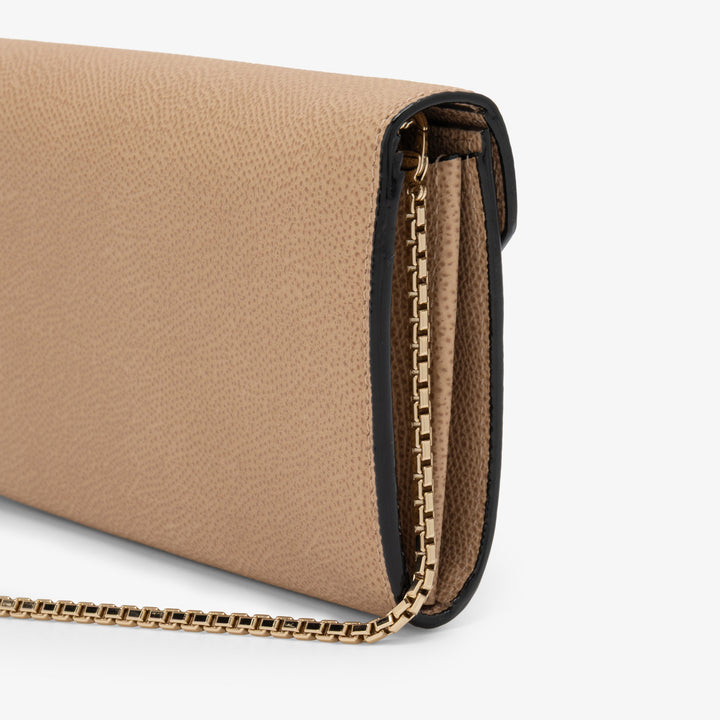 素材はソフトカーフスキン製、内側にはコンパートメントが3つと6枚のカード用のスロット付き。取り外し可能なジッパー式コインケースにはカードスロットが4つあり、クラッチの中に入れて使うのはもちろん、コインケース単体でもお使いいただけます。ヴァレクストラのアイコニックなクロージャーと取り外し可能なゴールドのチェーンのショルダーストラップ付き。