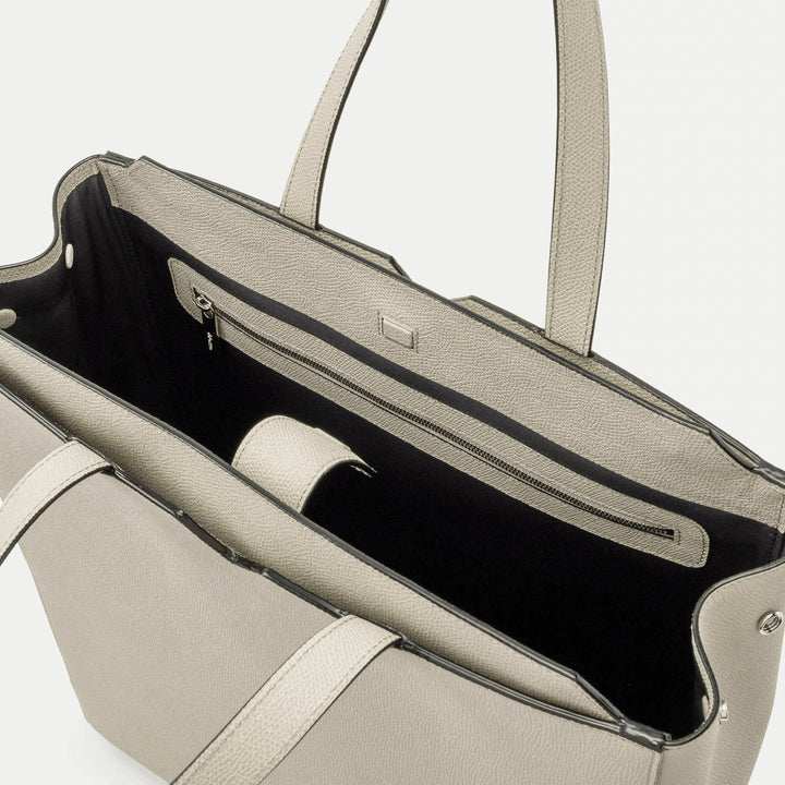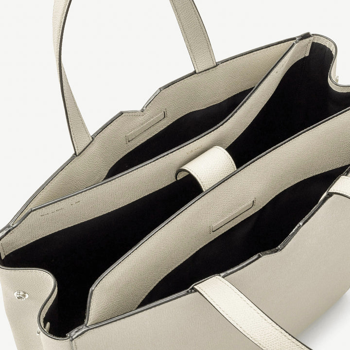 スナップボタンでマチ幅を調節できるメインのコンパートメントと、手元に置いておきたい持ち物を整理するのに便利なコンパートメントが両側にあります。バッグの内側には貴重品もしまっておけるファスナー付きのポケットも。