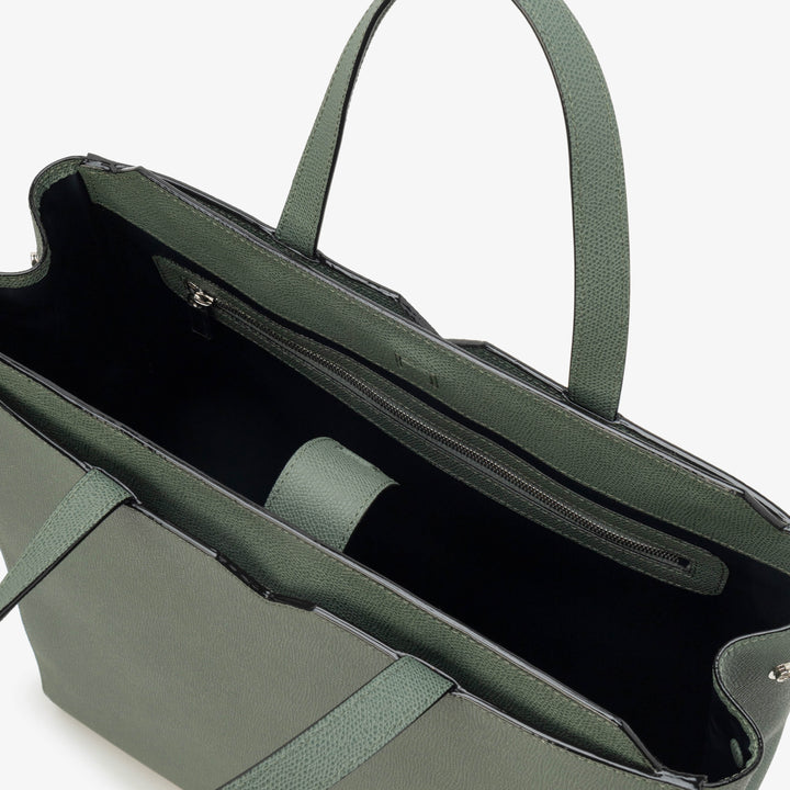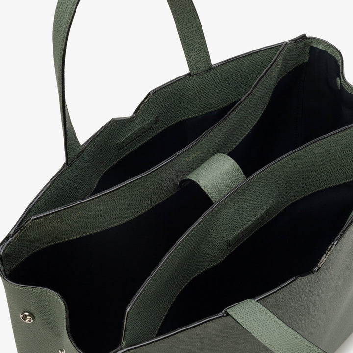 スナップボタンでマチ幅を調節できるメインのコンパートメントと、手元に置いておきたい持ち物を整理するのに便利なコンパートメントが両側にあります。バッグの内側には貴重品もしまっておけるファスナー付きのポケットも。