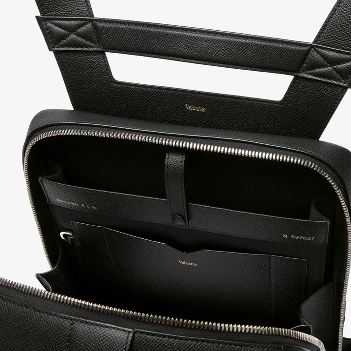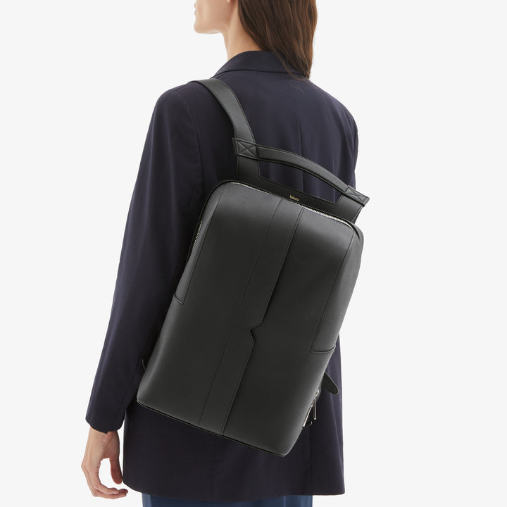 ボクシーなシルエットでありながら特別に柔らかく仕上げられたミレプンテソフトレザーを使用したこのバックパックは、15インチのノートPCまで収納できる実用性とエレガンスを兼ね揃えています。