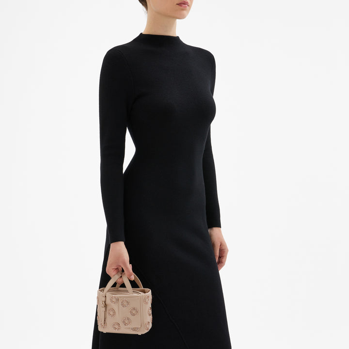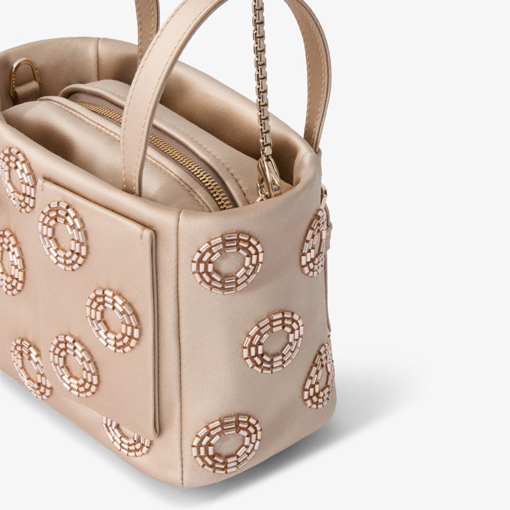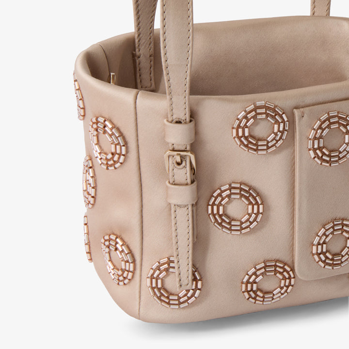 バケットバッグ ナノ ソフト フィズは、アイコンを新しいシルエットや素材で進化させ続けるヴァレクストラの革新性へのオマージュとして誕生しました。手に取るたび、眺めるたびに心が弾むような存在感を放ちます。サテンにガラスビーズを丁寧にあしらったこのバッグは、クラフツマンシップへの讃歌であり、華やかなシーンに寄り添う特別なパートナーです。細部に至るまで緻密に仕上げられ、美しさと審美眼を兼ね備えたオブジェのような佇まい。同時に、実用性も備えています。メインコンパートメントには取り外し可能なサテンポーチが付属し、貴重品をしっかりと保護。メタルストラップを付ければクロスボディとしても、トップハンドルで手持ちとしても楽しめます。