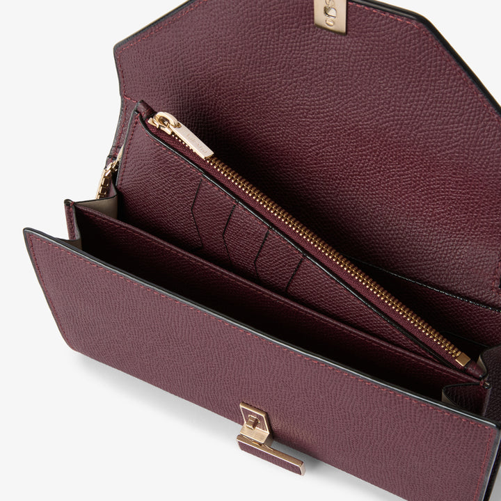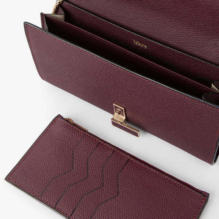 素材はソフトカーフスキン製、内側にはコンパートメントが3つと6枚のカード用のスロット付き。取り外し可能なジッパー式コインケースにはカードスロットが4つあり、クラッチの中に入れて使うのはもちろん、コインケース単体でもお使いいただけます。ヴァレクストラのアイコニックなクロージャーと取り外し可能なゴールドのチェーンのショルダーストラップ付き。