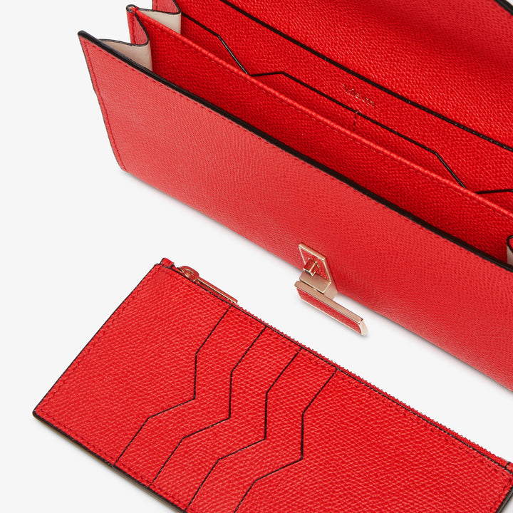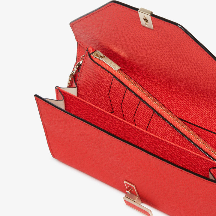 素材はソフトカーフスキン製、内側にはコンパートメントが3つと6枚のカード用のスロット付き。取り外し可能なジッパー式コインケースにはカードスロットが4つあり、クラッチの中に入れて使うのはもちろん、コインケース単体でもお使いいただけます。ヴァレクストラのアイコニックなクロージャーと取り外し可能なゴールドのチェーンのショルダーストラップ付き。