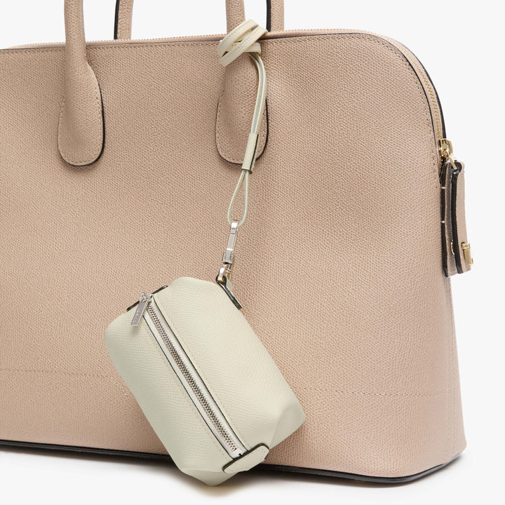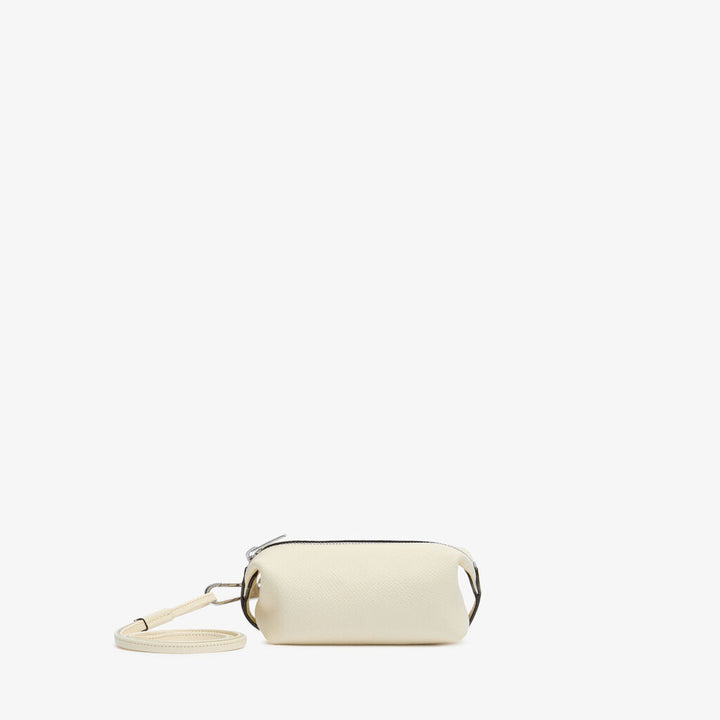 ストラップ付 ミニビューティポーチは、ヴァレクストラのバッグに遊び心あるアクセントを添えるアイテムです。ソフト ミレプンテレザーで仕立てられた本体は、細身の取り外し可能なストラップをトップハンドルに簡単に結び付けることができ、チャームのように楽しめます。内部には小さなコンパートメントがあり、ラッキーコインを数枚忍ばせるのに便利です。
