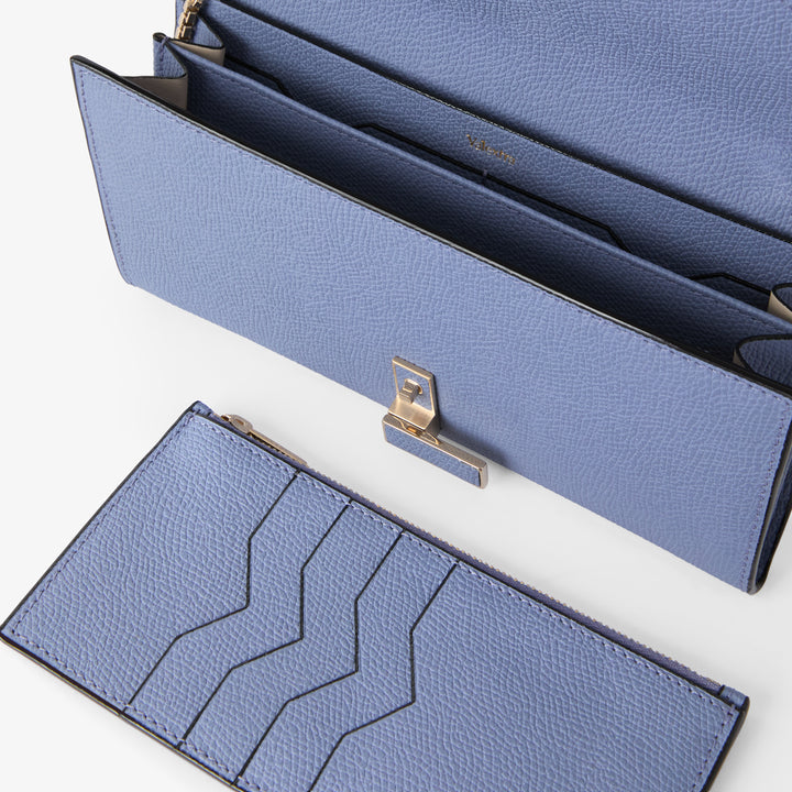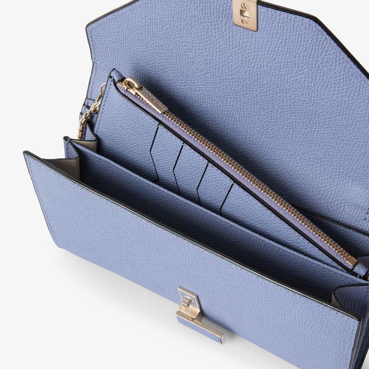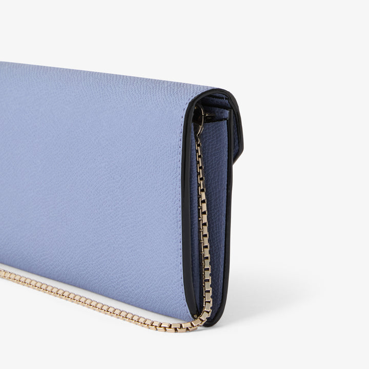 素材はソフトカーフスキン製、内側にはコンパートメントが3つと6枚のカード用のスロット付き。取り外し可能なジッパー式コインケースにはカードスロットが4つあり、クラッチの中に入れて使うのはもちろん、コインケース単体でもお使いいただけます。ヴァレクストラのアイコニックなクロージャーと取り外し可能なゴールドのチェーンのショルダーストラップ付き。