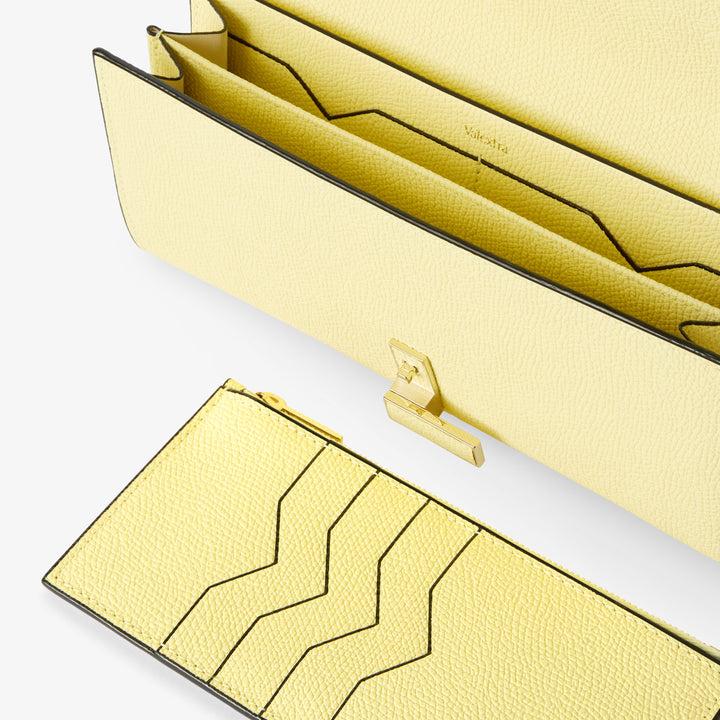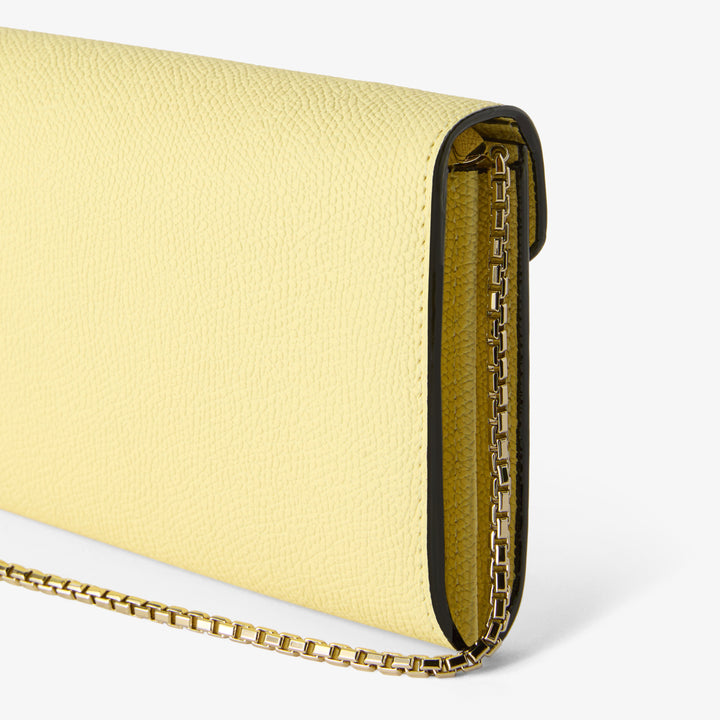素材はソフトカーフスキン製、内側にはコンパートメントが3つと6枚のカード用のスロット付き。取り外し可能なジッパー式コインケースにはカードスロットが4つあり、クラッチの中に入れて使うのはもちろん、コインケース単体でもお使いいただけます。ヴァレクストラのアイコニックなクロージャーと取り外し可能なゴールドのチェーンのショルダーストラップ付き。