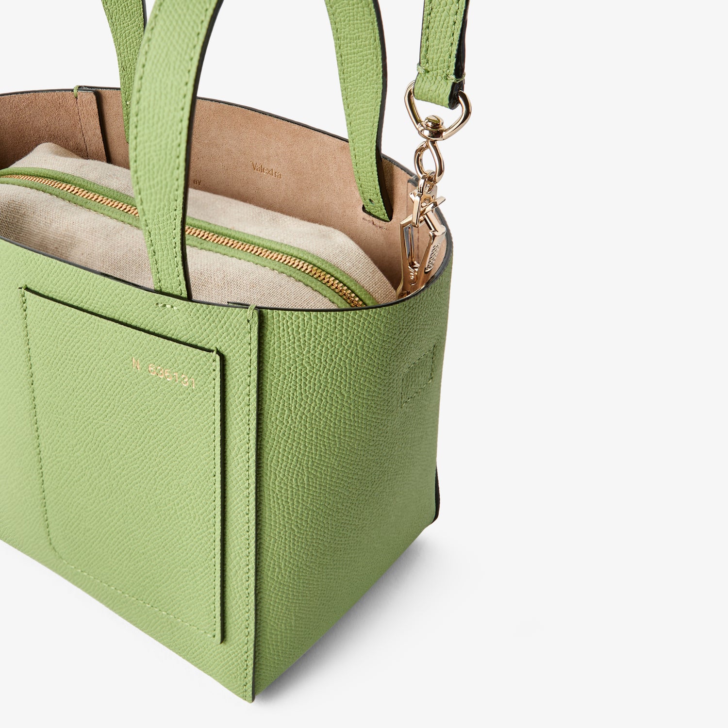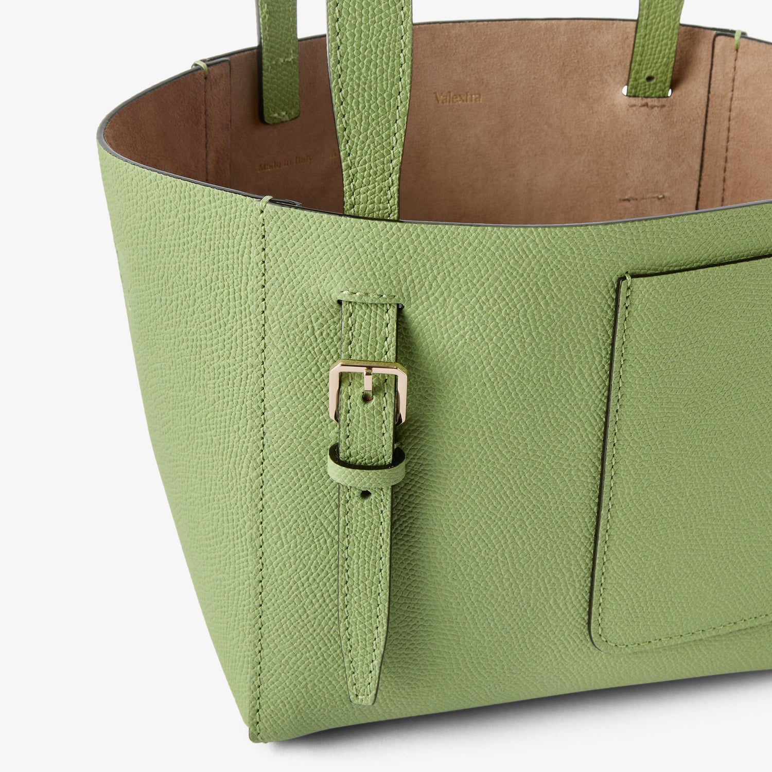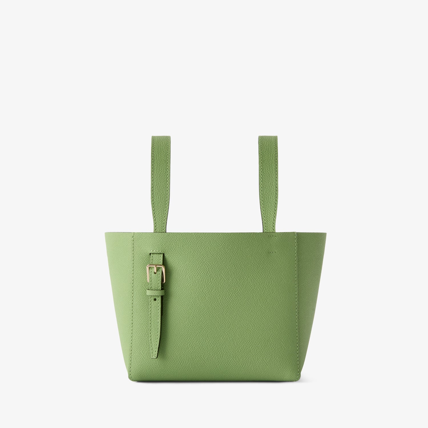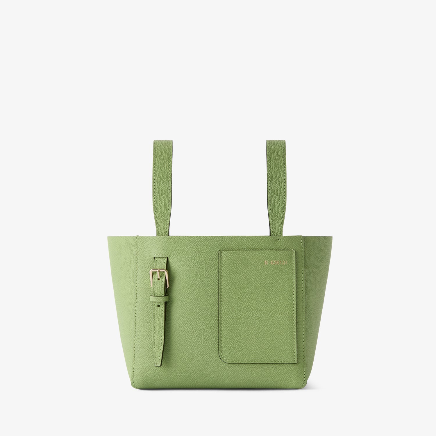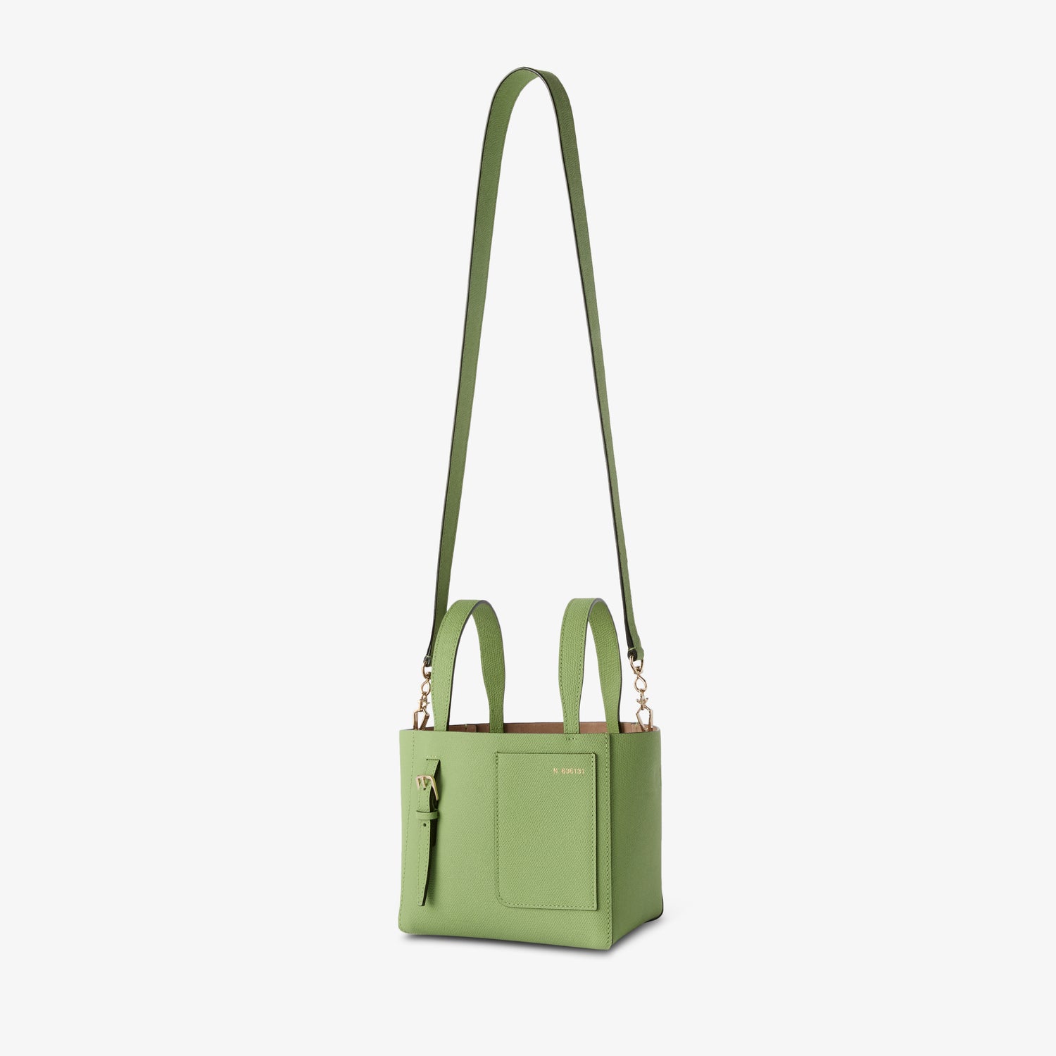 アロエグリーンのミレプンテカーフスキンで作られた構築的なオープントップのバケットバッグです。