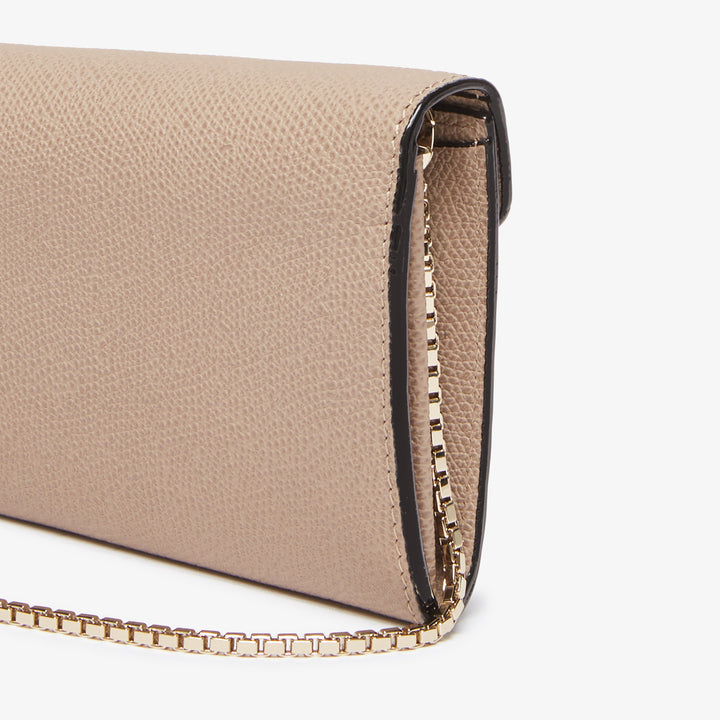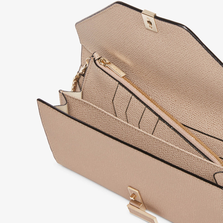 素材はソフトカーフスキン製、内側にはコンパートメントが3つと6枚のカード用のスロット付き。取り外し可能なジッパー式コインケースにはカードスロットが4つあり、クラッチの中に入れて使うのはもちろん、コインケース単体でもお使いいただけます。ヴァレクストラのアイコニックなクロージャーと取り外し可能なゴールドのチェーンのショルダーストラップ付き。