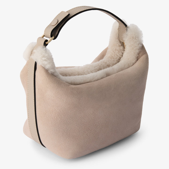 モチスエード シアリング トップハンドル ミニバッグは、五感を刺激し、手にする歓びと持つ悦びをもたらすアイテムです。ブランドのシグネチャーであるミレプンテレザーのスエード面を外側に、内側を全面シアリングでライニングし、その柔らかな質感が見えるデザインに仕上げています。