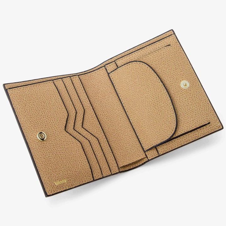 このコンパクトな財布は、エルゴノデザインである V カットを施したカードスロットとスナップフック付きの小銭入れを備え、カードと現金をきちんと整理して収納できます。パーツごとの境界を際立たせる手描きのインキオストロのラインや、コバに施された黒漆のコスタエッジペインティングなどのディテールが、ブランドの職人技へのこだわりを強調しています。