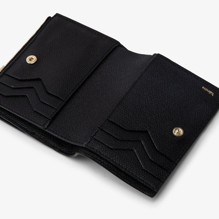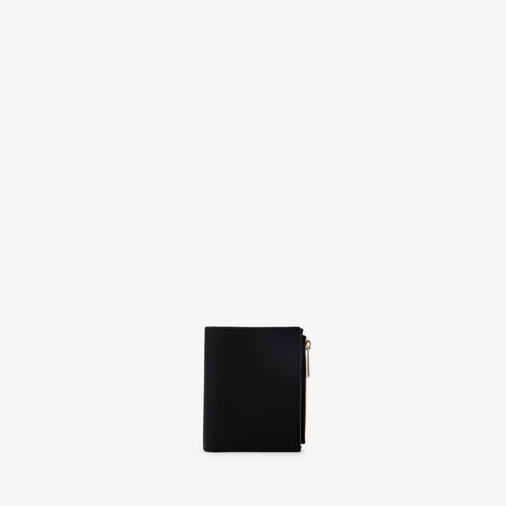 ミニマルなデザインながら、基本的な機能性を備えた二つ折り財布です。特徴的なV字のカットアウトを入れた6つのカードスロットに、2つのマルチなカードスロット、紙幣用のコンパートメント、さらにファスナー開閉の小銭用のコンパートメントがあります。コバに施された漆黒のエッジペインティングはすべて職人の手仕事によります。