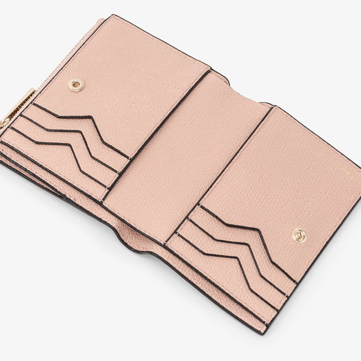 ミニマルなデザインながら、基本的な機能性を備えた二つ折り財布です。特徴的なV字のカットアウトを入れた6つのカードスロットに、2つのマルチなカードスロット、紙幣用のコンパートメント、さらにファスナー開閉の小銭用のコンパートメントがあります。コバに施された漆黒のエッジペインティングはすべて職人の手仕事によります。