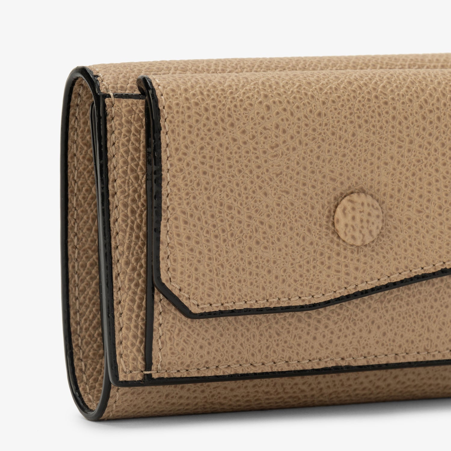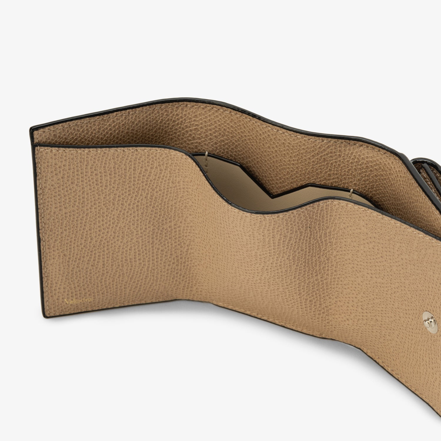 3つ折りウォレット。前面にコインケース、札入れの中には3カードホルダー付き。 コバと呼ばれる革をカットした端の部分にヴァレクストラ独自の染料”Costa”を手作業で何層にも塗り重ねて磨き上げました。