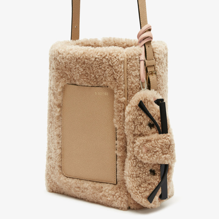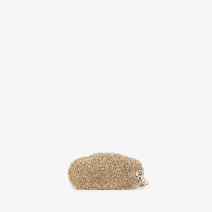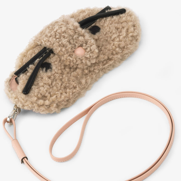 柔らかなシアリング素材とミレプンテレザーで作られた、アニマルモチーフの遊び心のあるメガネケース。ストラップ付きで、アクセサリーのように首から下げて着用したり、バッグにチャーム感覚で取り付けて楽しむこともできます。