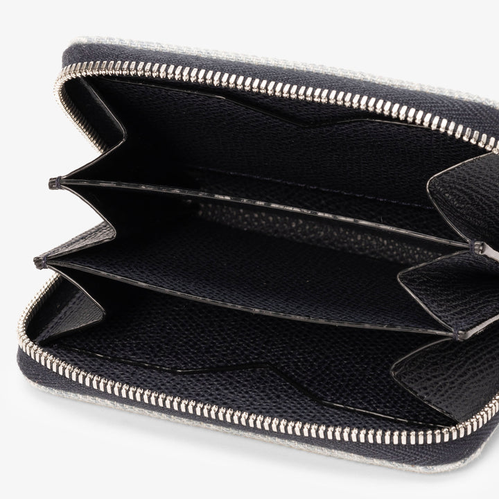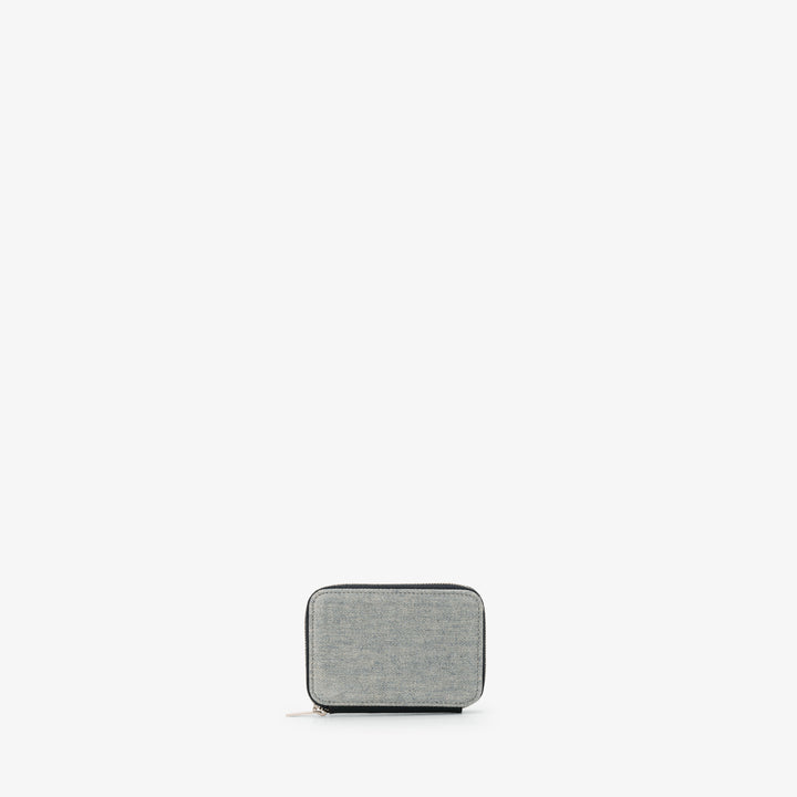 ジップ式のミニウォレットです。テキスタイル部分はリサイクルデニムを使用しています。紙幣や小銭、カード類を分けて収納できるマチ付きです。