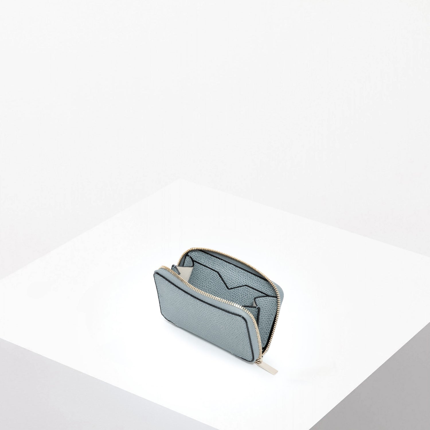 ジップ式のミニウォレット。豊富なカラーバリエーションを展開しています。内側にはブランドの象徴であるV字カットが施されたクレジットカードホルダー2つ付き。