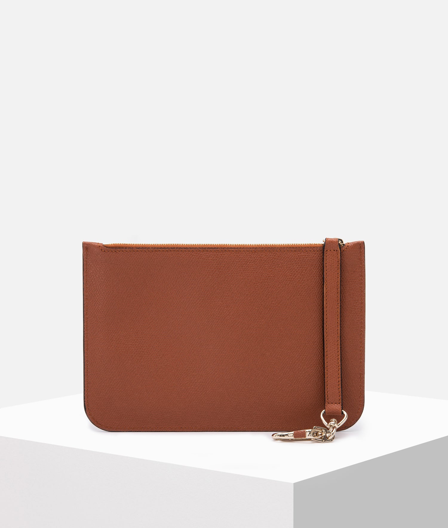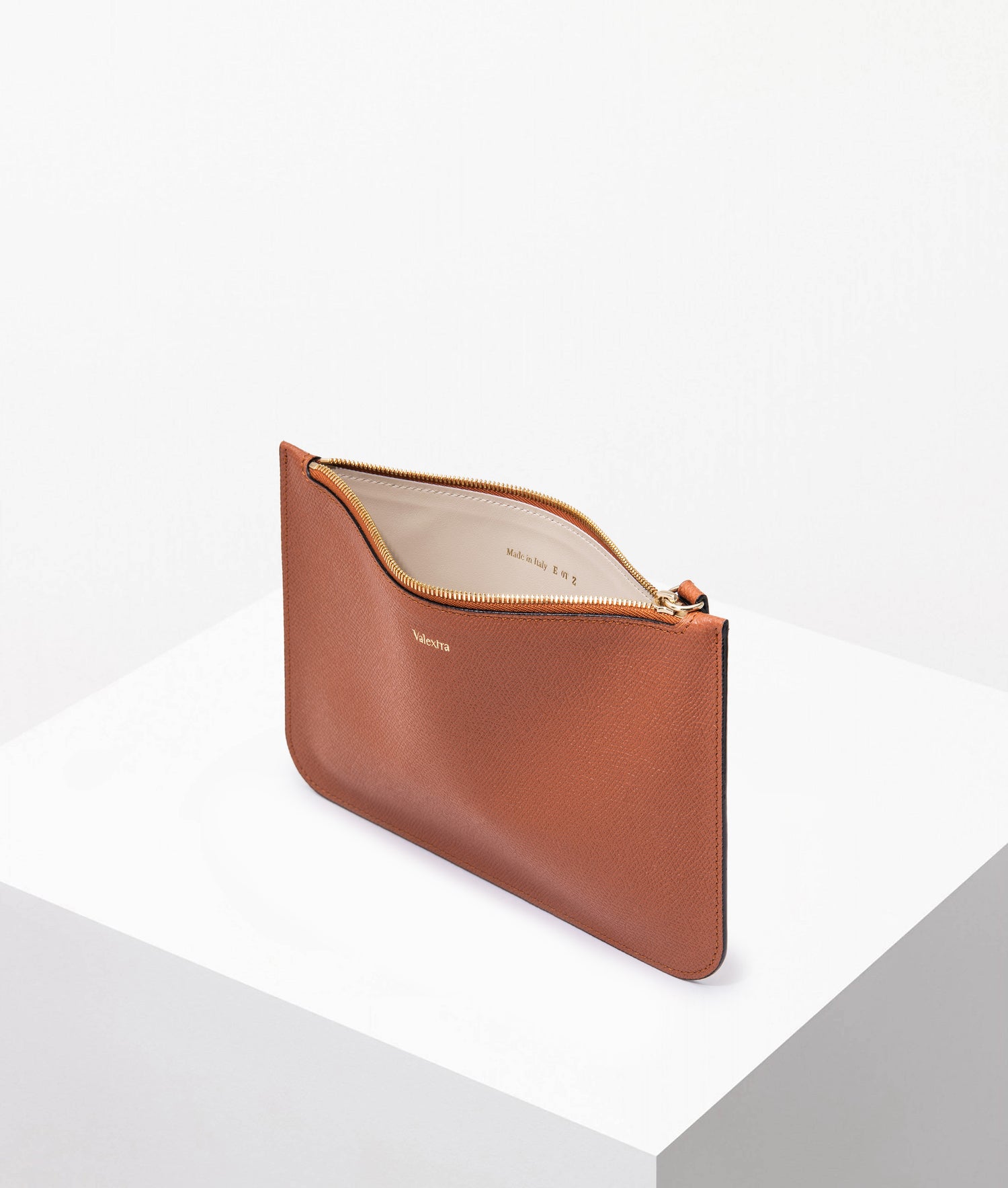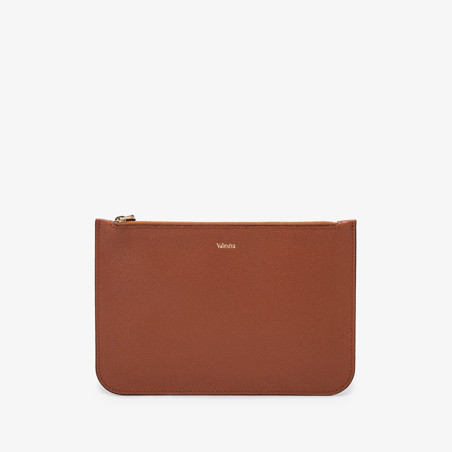 柔らかいカーフスキン素材で、ストラップとライトゴールドクラスプが付いていて、内部に取り付けることができます。 開閉はジッパー式、ライナーは革張り。