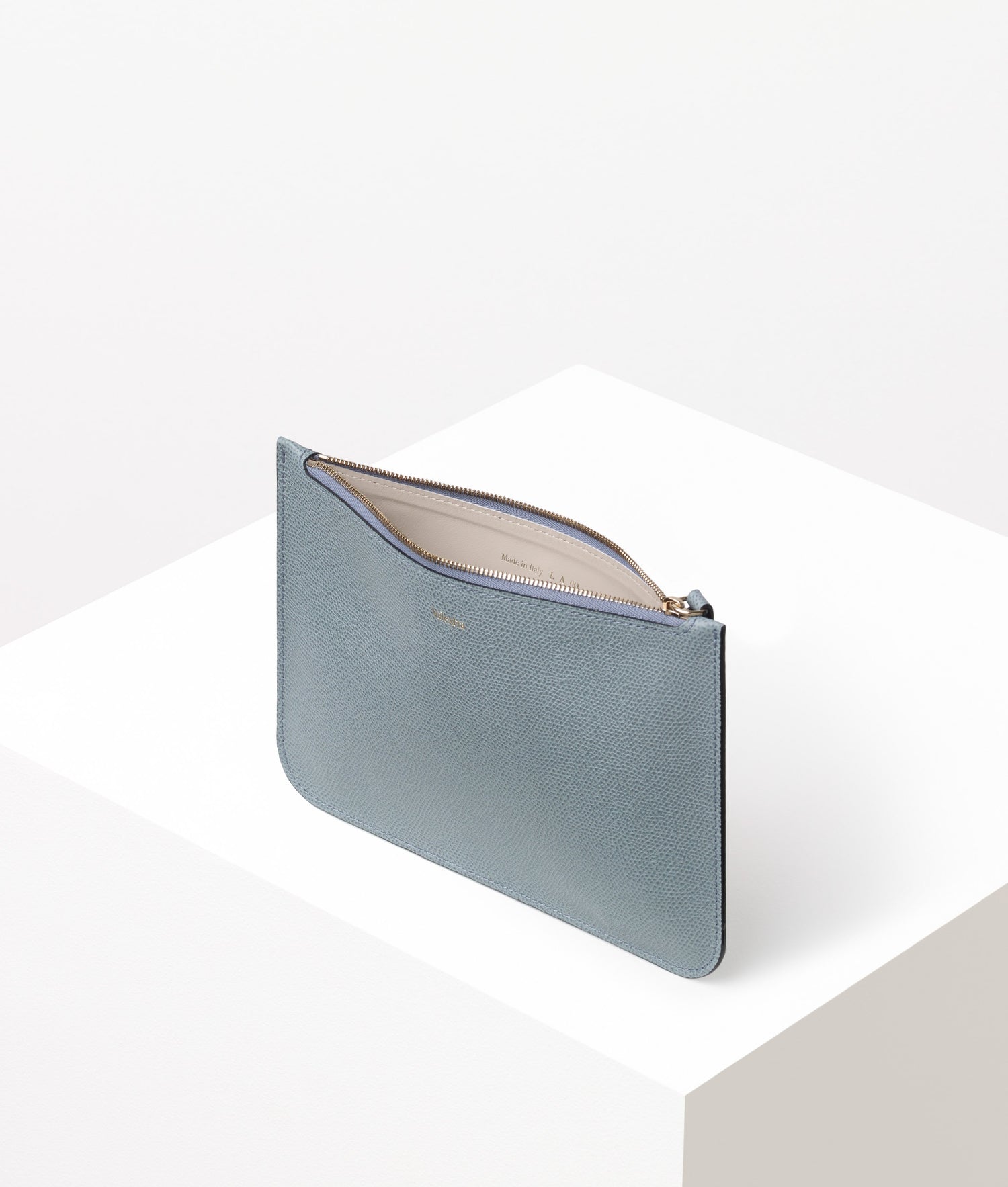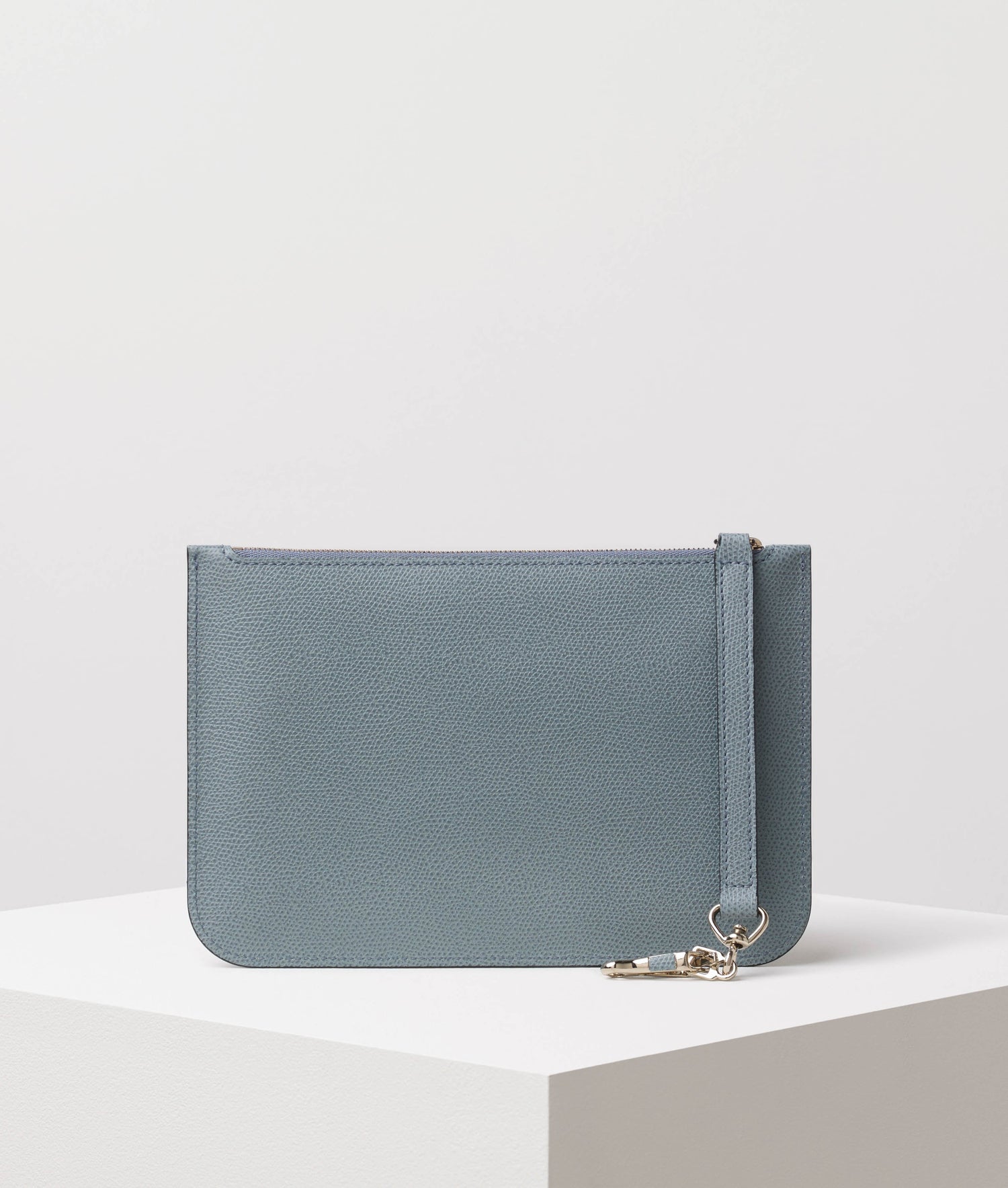 柔らかいカーフスキン素材で、ストラップとライトゴールドクラスプが付いていて、内部に取り付けることができます。 開閉はジッパー式、ライナーは革張り。