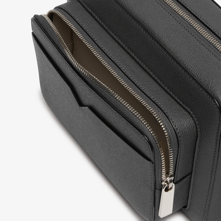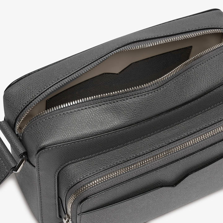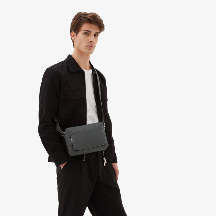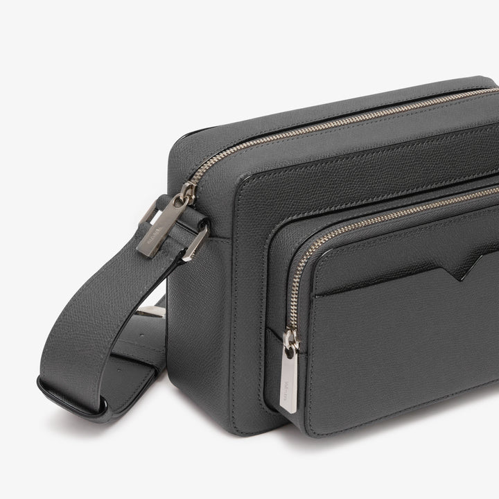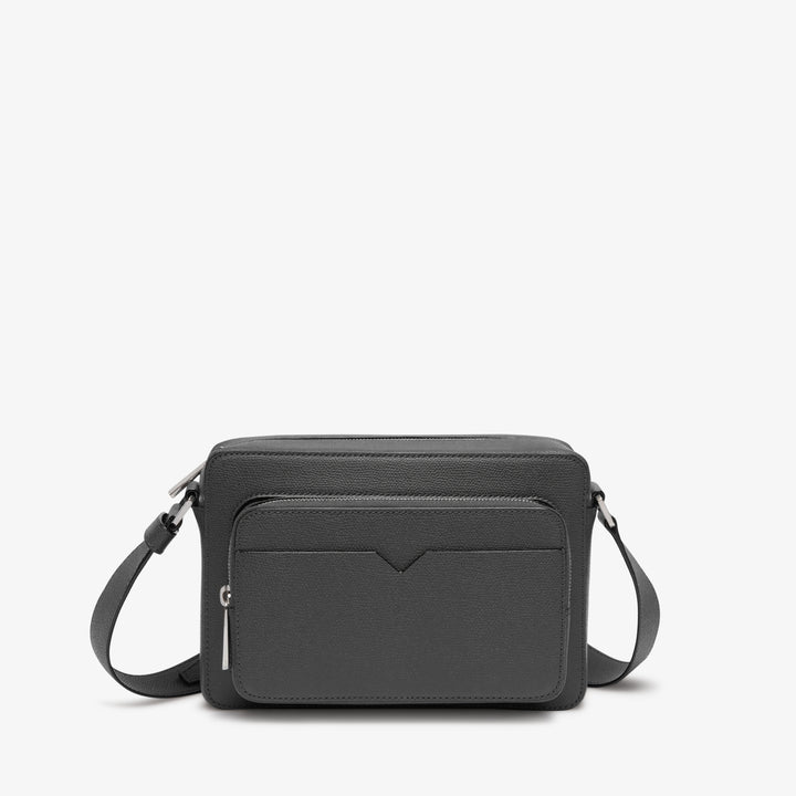 ミニマルなデザインのレポーターバッグです。メインのコンパートメントに加えて、小物の出し入れに適したマチ付きの外ポケットとさらにV字カットを施したオープンポケットを備えています。ストラップは長さ調節が可能です。