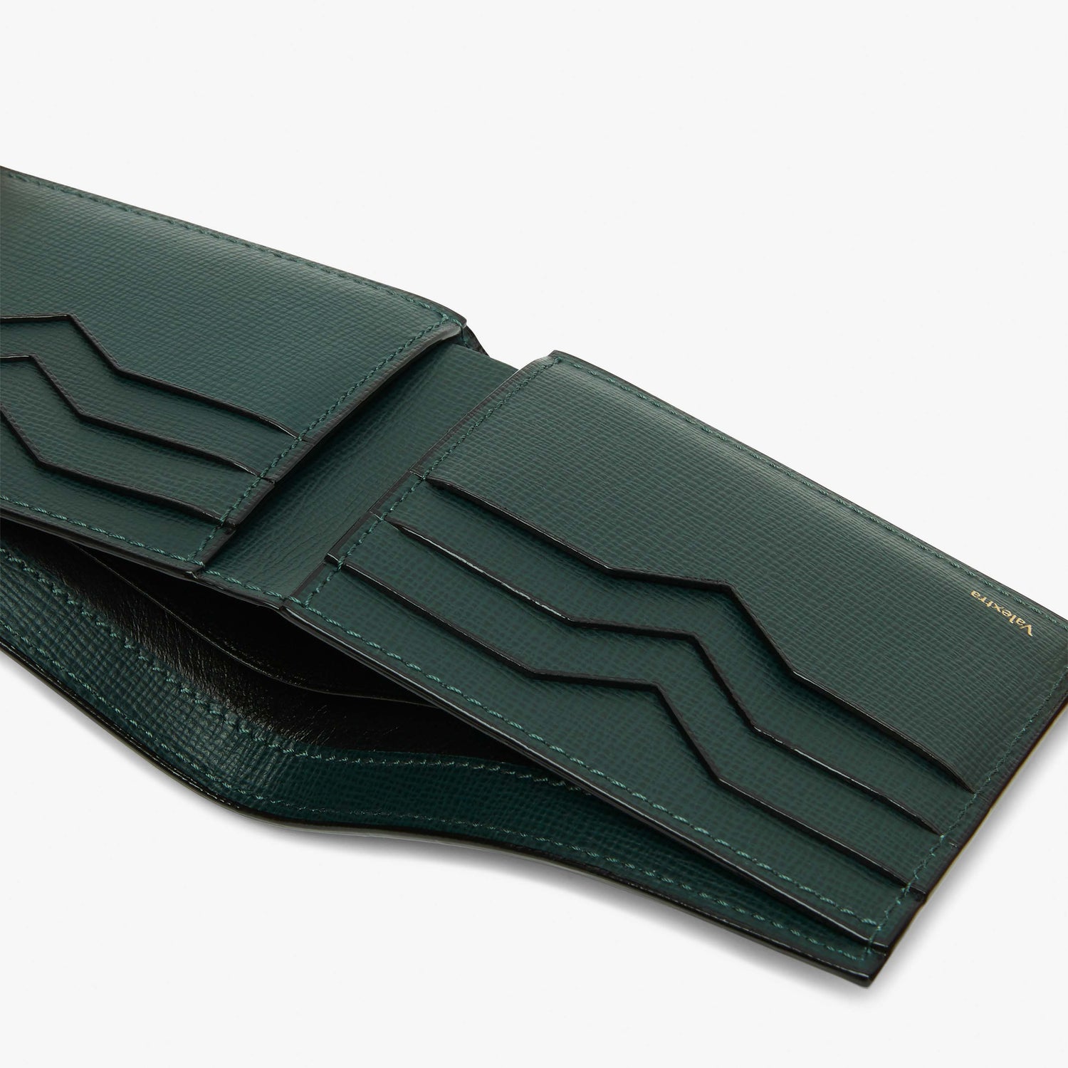 時代にとらわれないエレガントでクラシックな2つ折り財布は、今も必携のアイテムです。ブランドの象徴であるV字カットが施された6つのクレジットカードスロット、多目的のコンパートメント2つ付き。ライナーは革張り。
