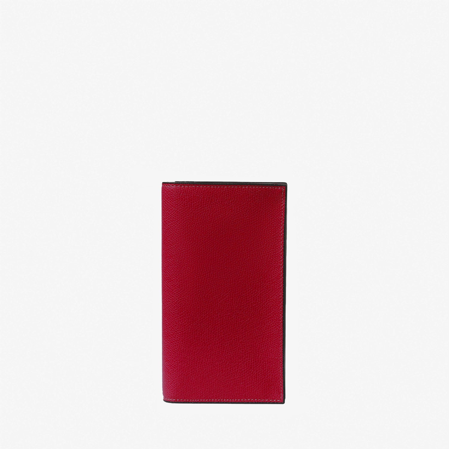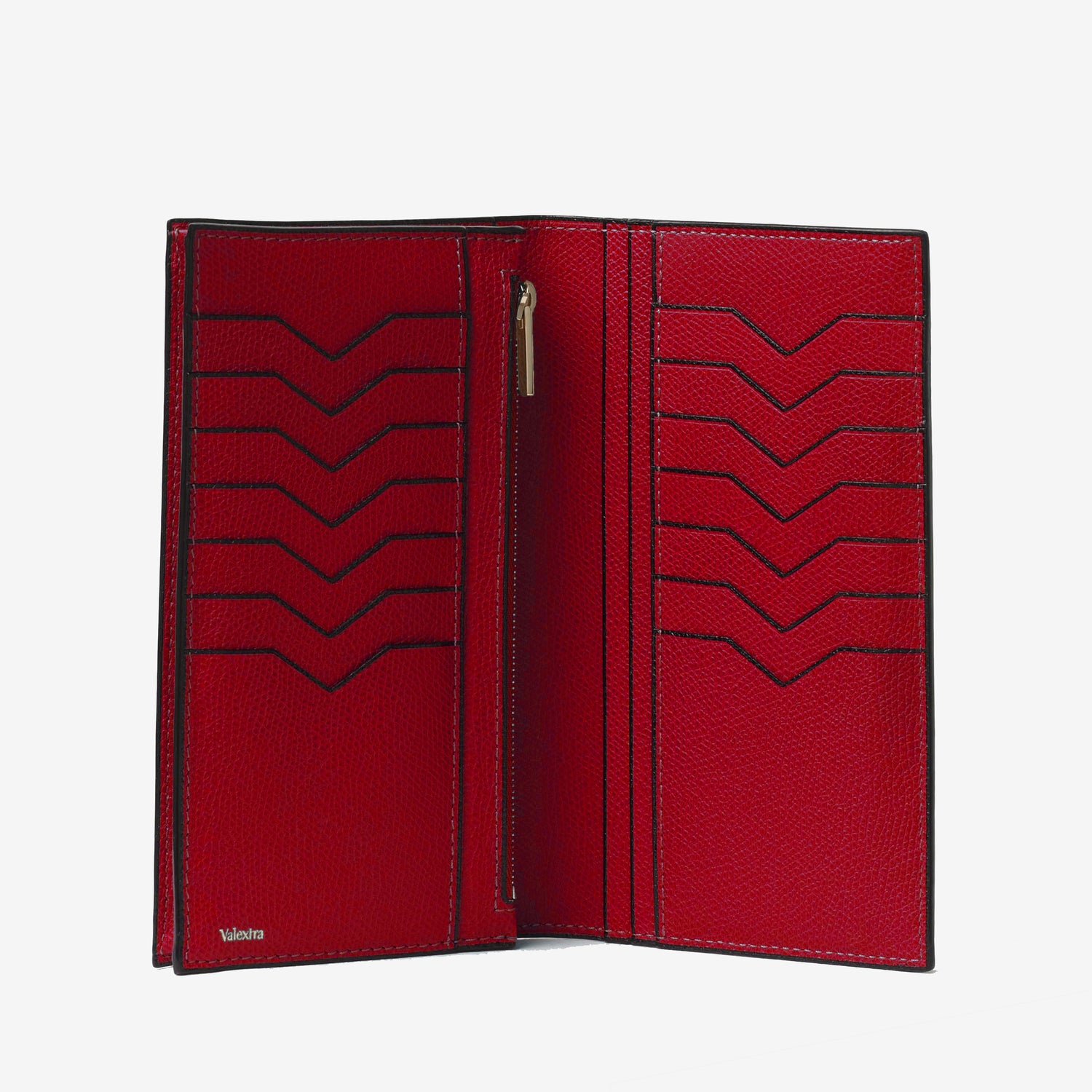 ジップ式コインケース付きの長財布。ブランドの象徴であるV字カットが施された14枚用クレジットカードスロット付き。 コバと呼ばれる革をカットした端の部分にヴァレクストラ独自の染料”Costa”を手作業で何層にも塗り重ねて磨き上げました。