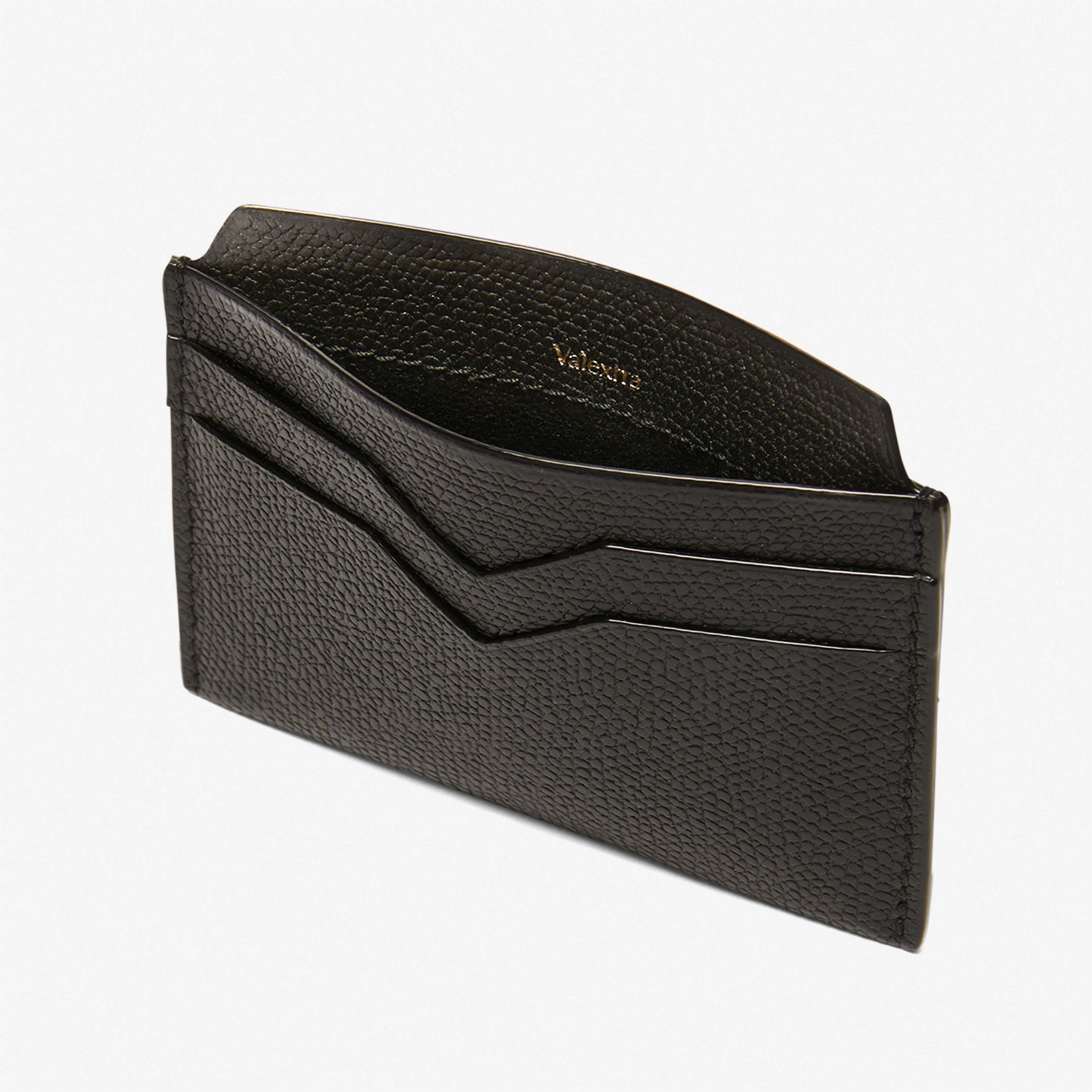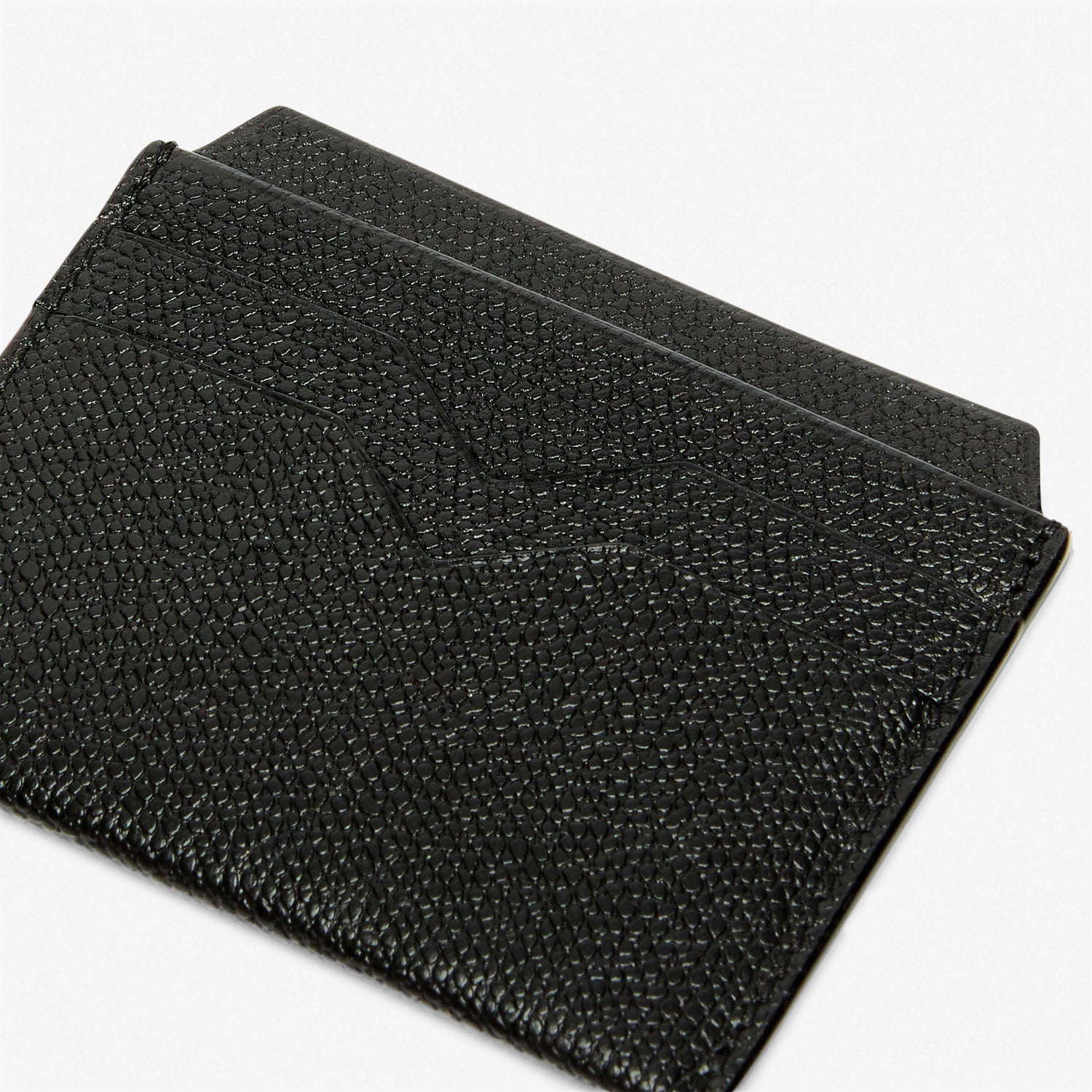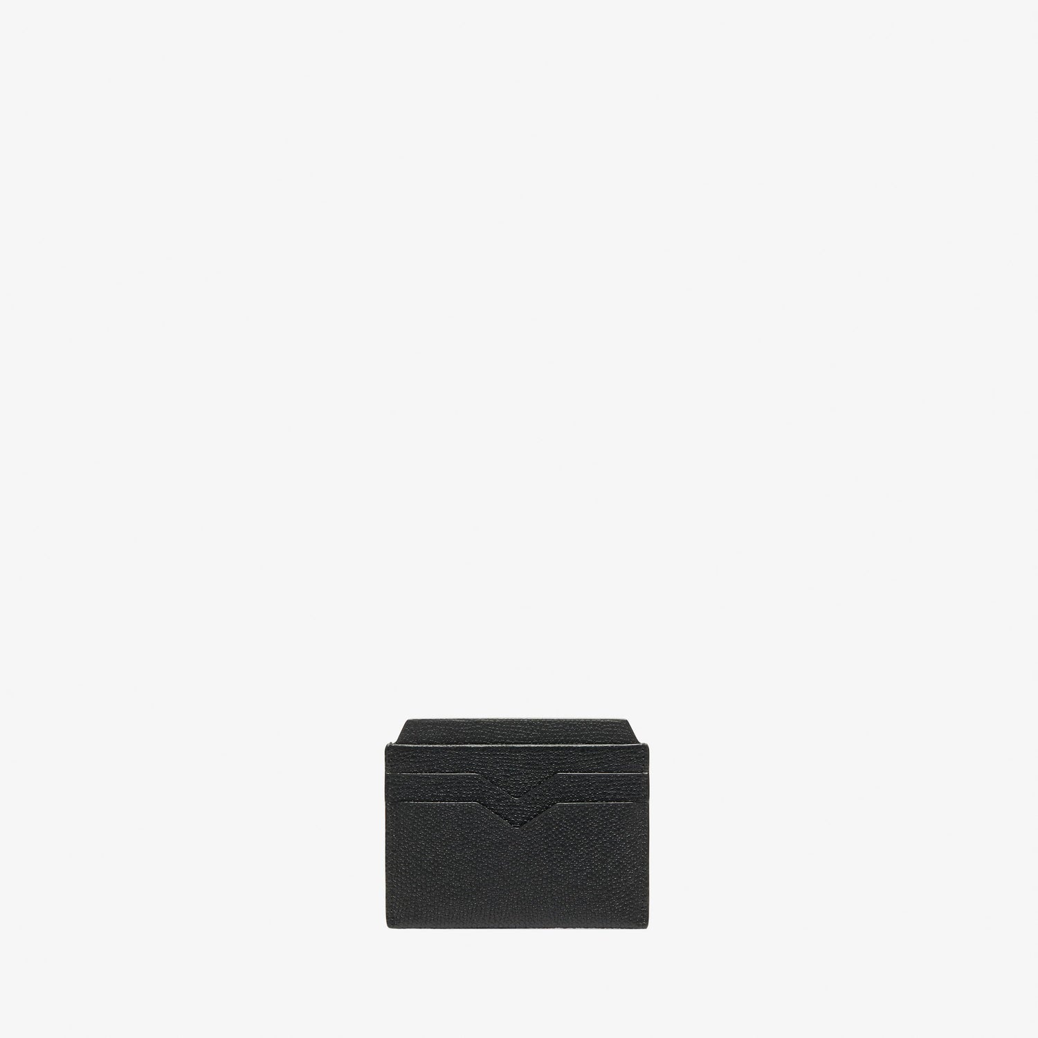 さりげなくエレガントな素材感のカードホルダーは、いつの世も必ず手元に置いておきたいアイテムです。ブランドの象徴であるV字カットが施された4つのクレジットカード用のスロットと中央に2つの仕切り付きスロット。ライナーは革張り。