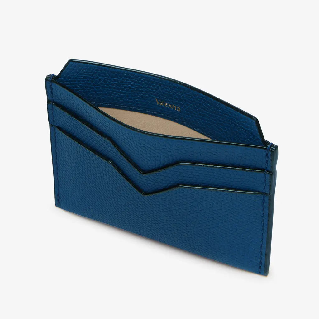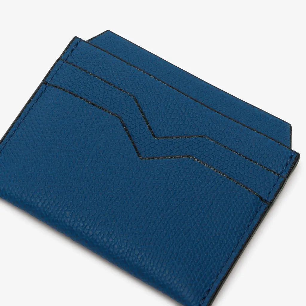 さりげなくエレガントな素材感のカードホルダーは、いつの世も必ず手元に置いておきたいアイテムです。ブランドの象徴であるV字カットが施された4つのクレジットカード用のスロットと中央に2つの仕切り付きスロット。ライナーは革張り。