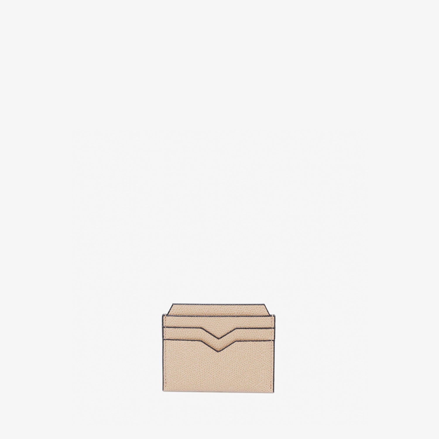 さりげなくエレガントな素材感のカードホルダーは、いつの世も必ず手元に置いておきたいアイテムです。ブランドの象徴であるV字カットが施された4つのクレジットカード用のスロットと中央に2つの仕切り付きスロット。ライナーは革張り。